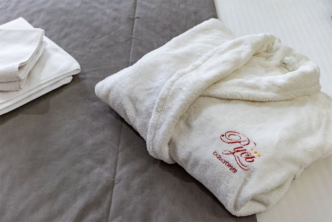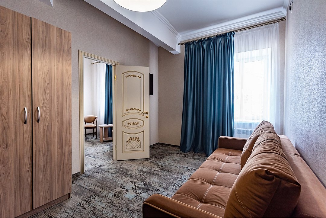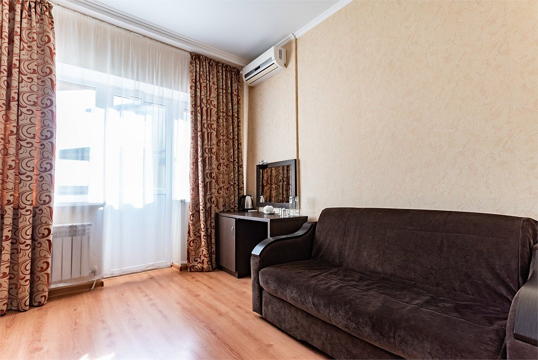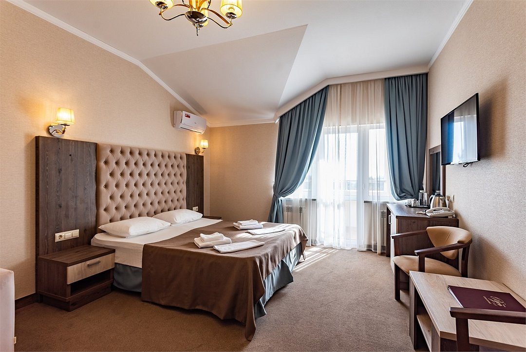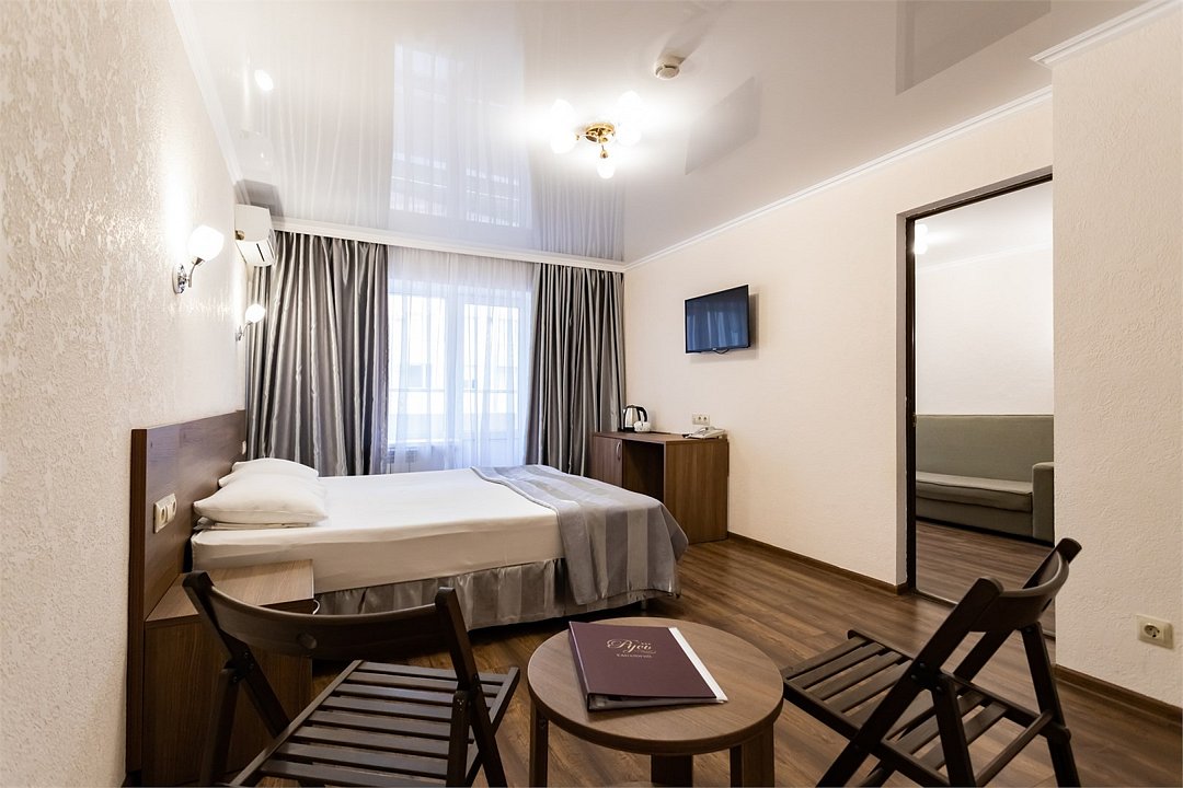 Двухкомнатный двухместный номер Комфорт площадью от 25 кв.м., с балконом. На два основных места предоставлена двуспальная/две односпальные кровати. Два дополнительных места на раскладном диване. В номере: зеркало, прикроватные тумбочки, стол, стулья, холодильник, телевизор, электрический чайник, система климат-контроль. Санузел с душевой кабиной, также имеются туалетные и банные принадлежности, тапочки, халат, фен.Услуги и удобства
