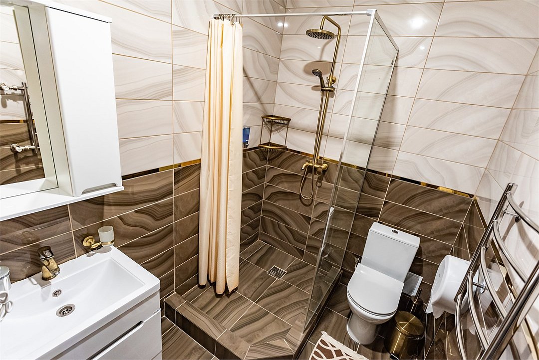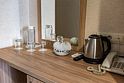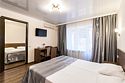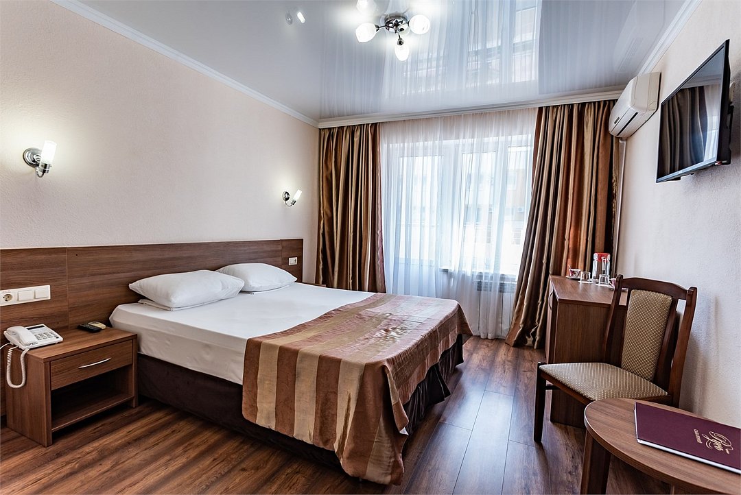 Однокомнатный двухместный номер Комфорт S площадью 16 кв.м. На основные места предоставлена двуспальная/две односпальные кровати. В номере: зеркало, прикроватные тумбочки, стол, стулья, холодильник, телевизор, электрический чайник, сейф, система климат-контроль. Санузел с душевой кабиной, также имеются туалетные и банные принадлежности, тапочки, халат, фен.Услуги и удобства