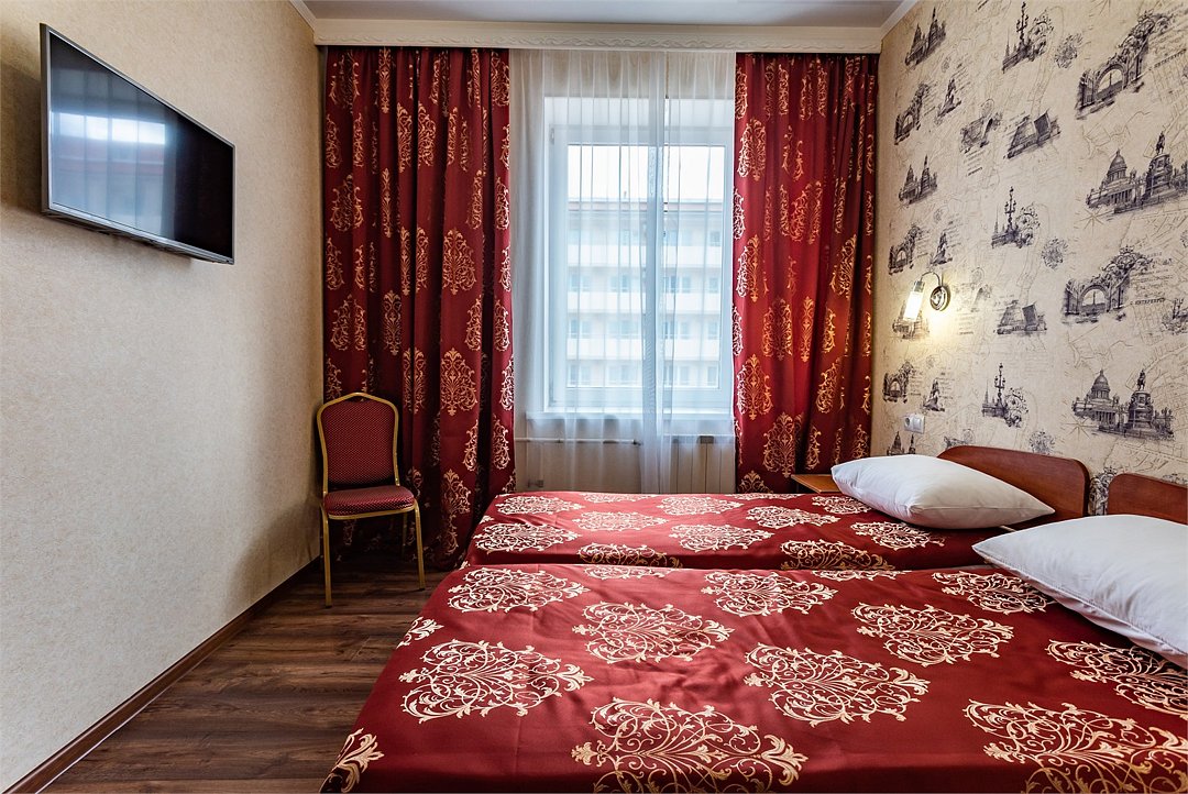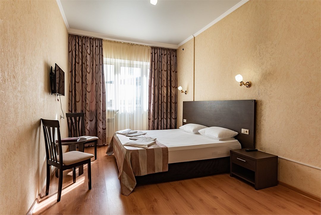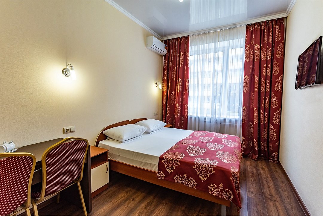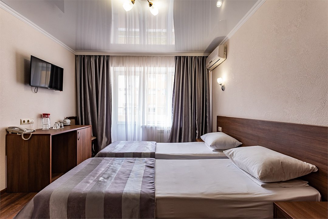 Двухместный номер Эконом площадью 16 кв.м., без балкона. На основные места предоставлена двуспальная/две односпальные кровати. Одно дополнительное место на еврораскладушке. В номере: зеркало, прикроватные тумбочки,стулья, холодильник, телевизор, система климат-контроль. Санузел с душевой кабиной, также имеются туалетные и банные принадлежности, фен.Услуги и удобства