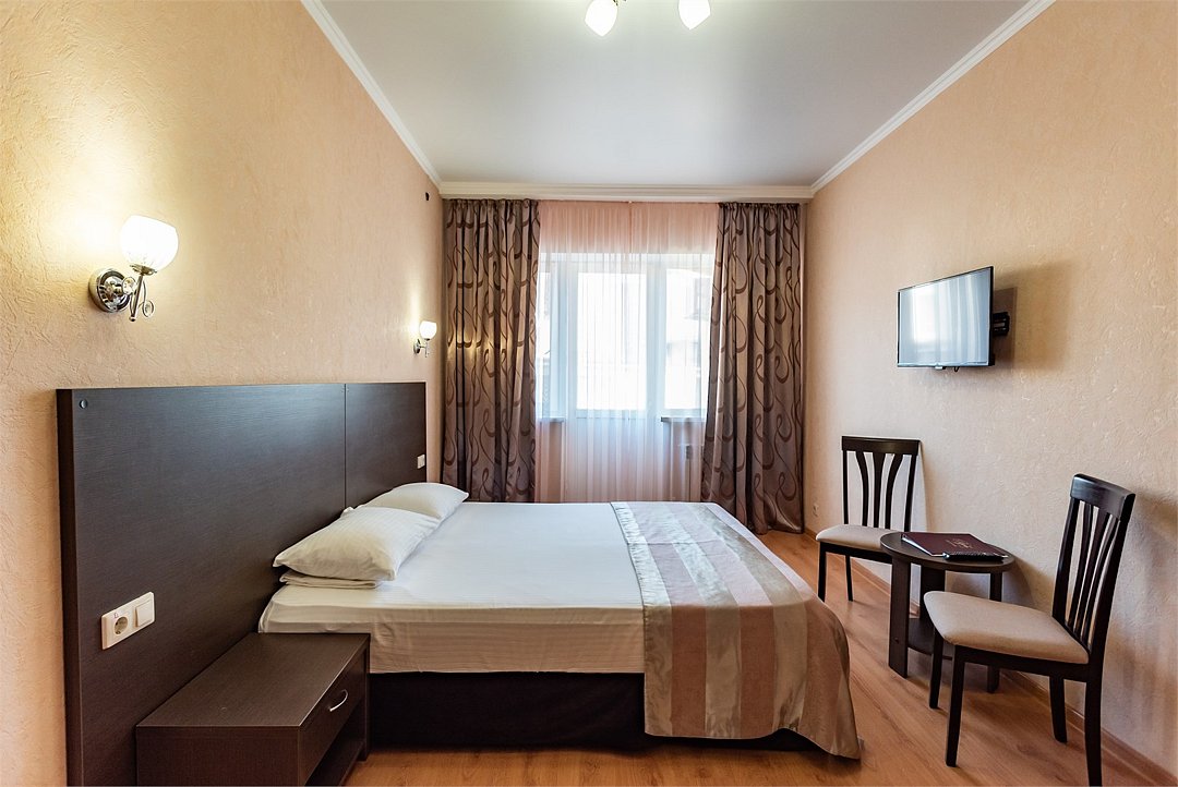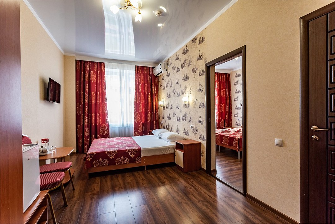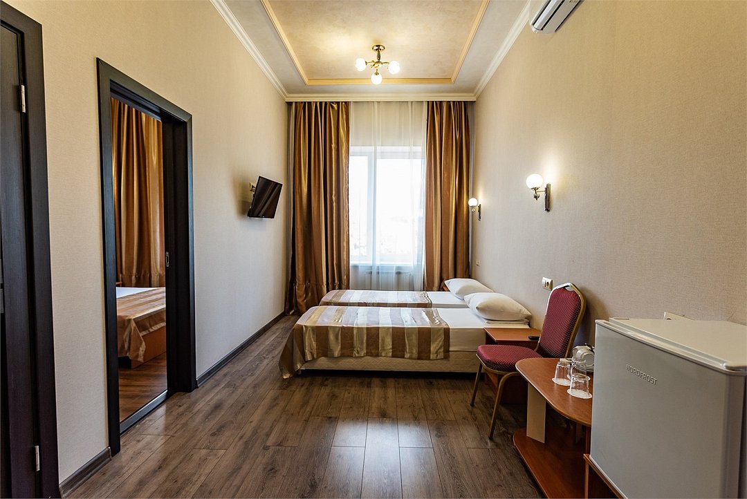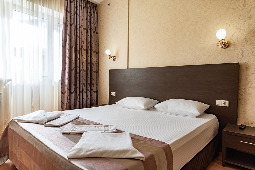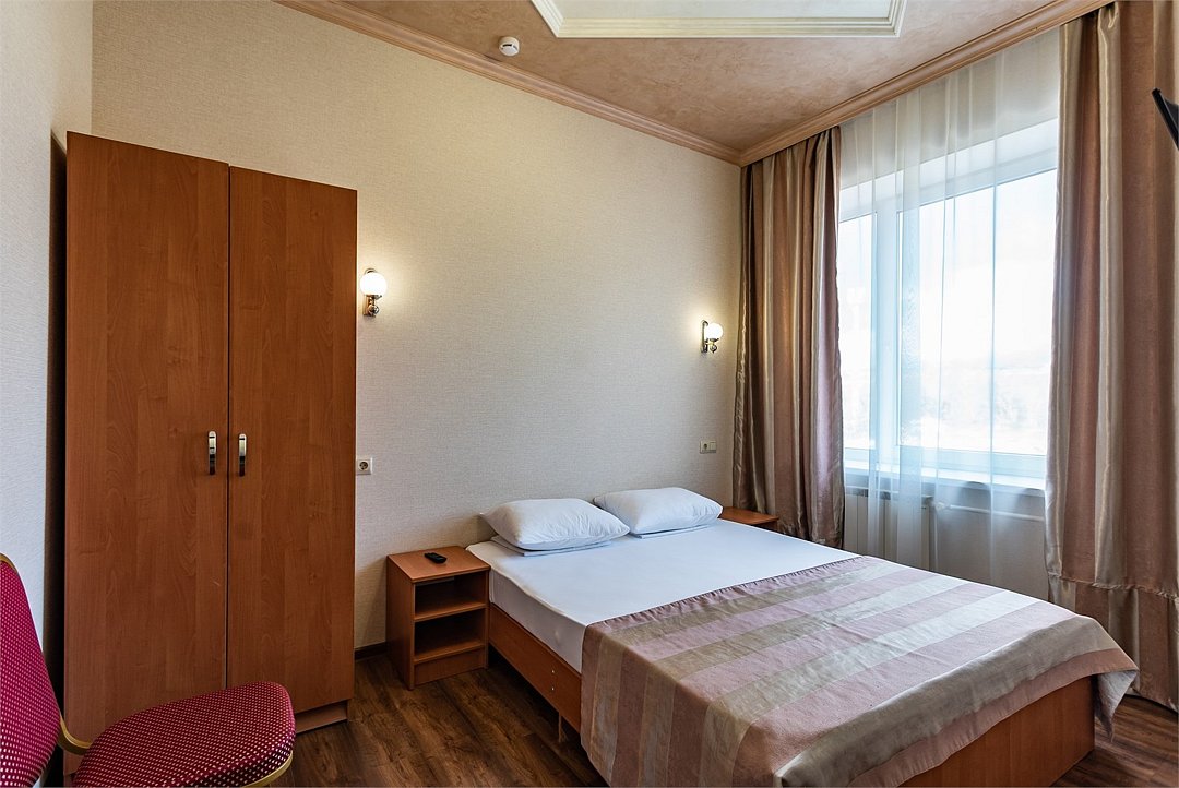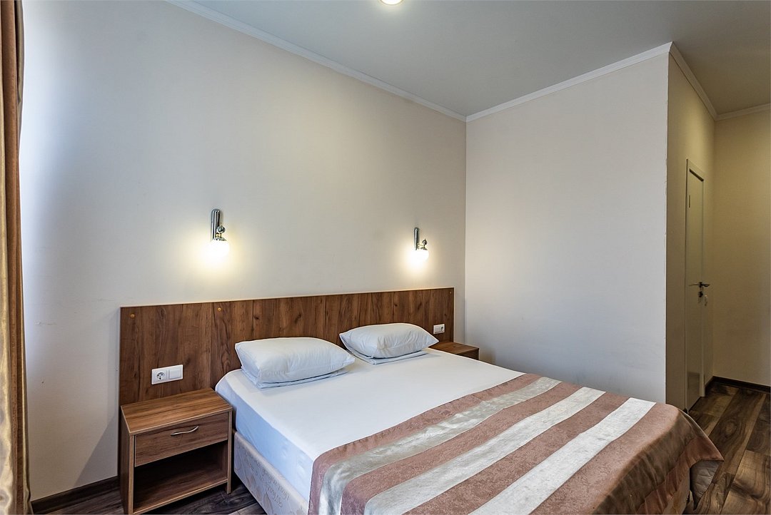 Двухкомнатный двухместный номер Эконом площадью 26 кв.м., без балкона. На основные места предоставлена двуспальная/две односпальные кровати. Одно дополнительное место на диван-кровате. В номере: зеркало, прикроватные тумбочки, стулья, холодильник, телевизор, система климат-контроль. Санузел с душевой кабиной, также имеются туалетные и банные принадлежности, фен.Услуги и удобства