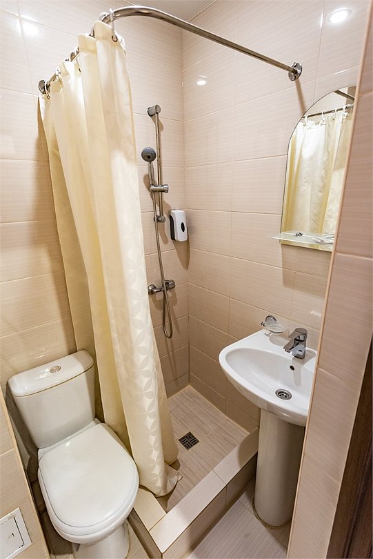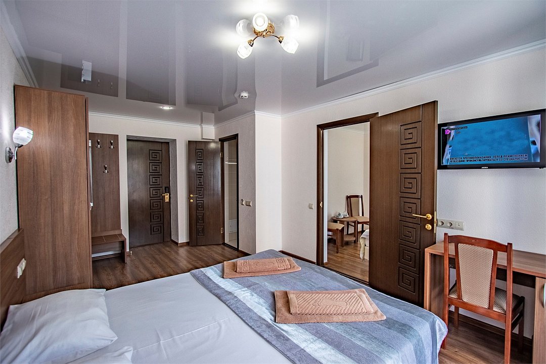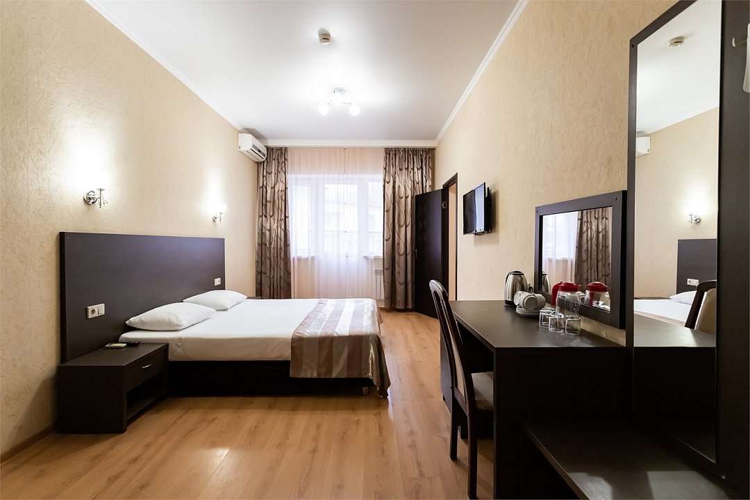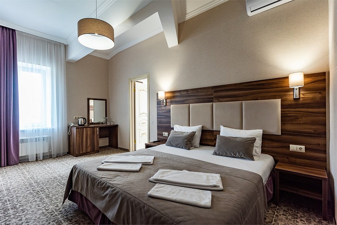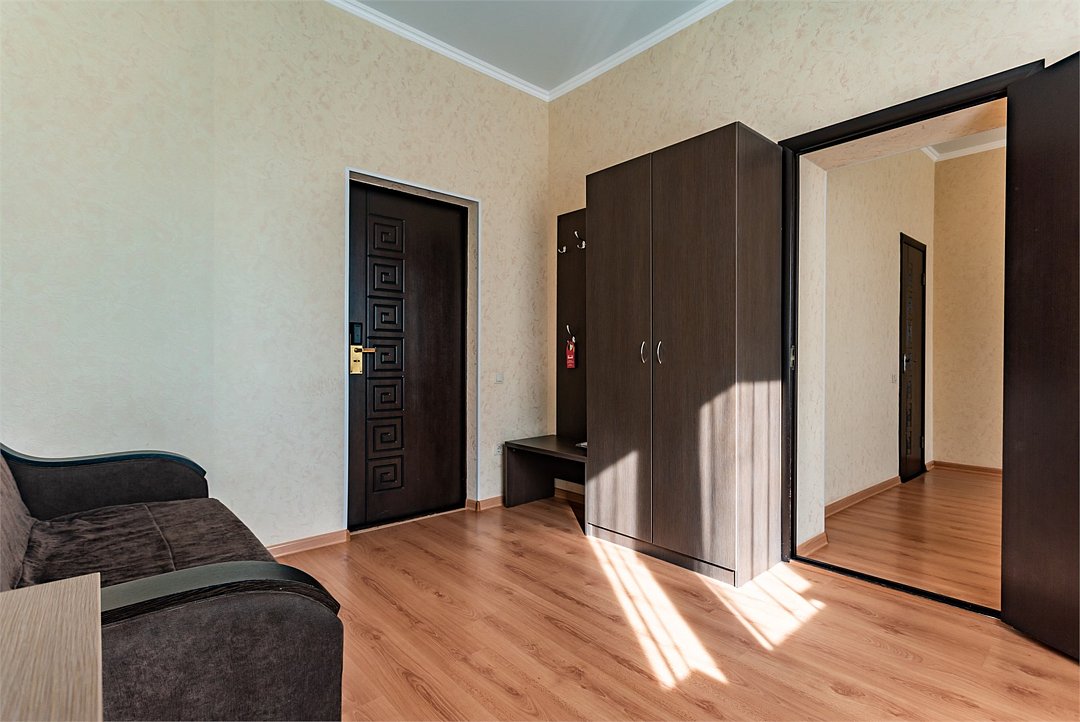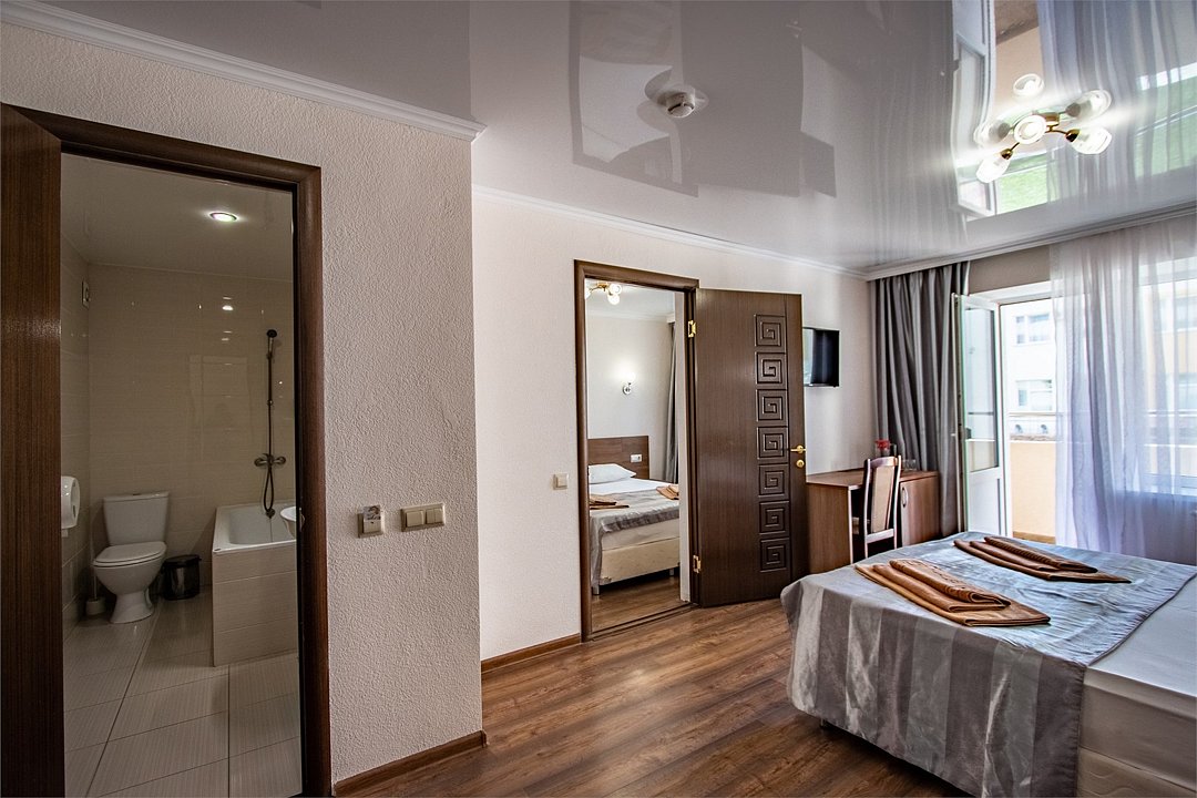 Двухкомнатный двухместный номер Эконом площадью 26 кв.м., без балкона. На основные места предоставлена двуспальная/две односпальные кровати. Одно дополнительное место на диван-кровате. В номере: зеркало, прикроватные тумбочки, стулья, холодильник, телевизор, система климат-контроль. Санузел с душевой кабиной, также имеются туалетные и банные принадлежности, фен.Услуги и удобства