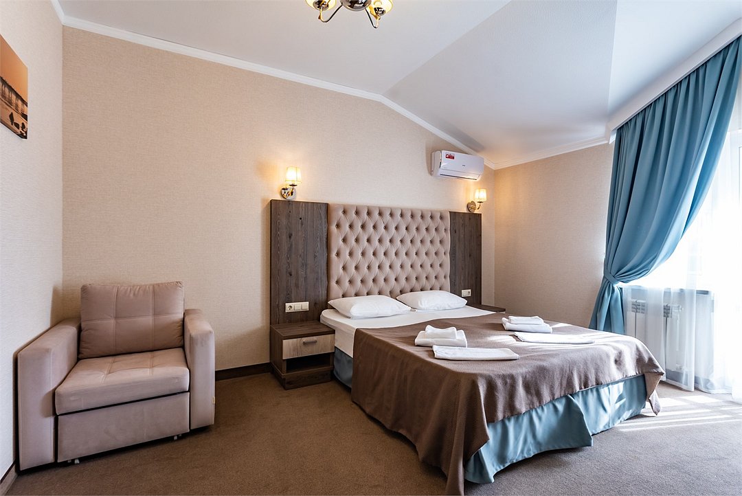 Однокомнатный двухместный номер Комфорт площадью 20 кв.м., с балконом. На основные места предоставлена двуспальная/две односпальные кровати. Два дополнительных места на кресле и евро-раскладушке. В номере: зеркало, прикроватные тумбочки, стол, стулья, холодильник, телевизор, электрический чайник, сейф, система климат-контроль. Санузел с душевой кабиной, также имеются туалетные и банные принадлежности, тапочки, халат, фен.Услуги и удобства