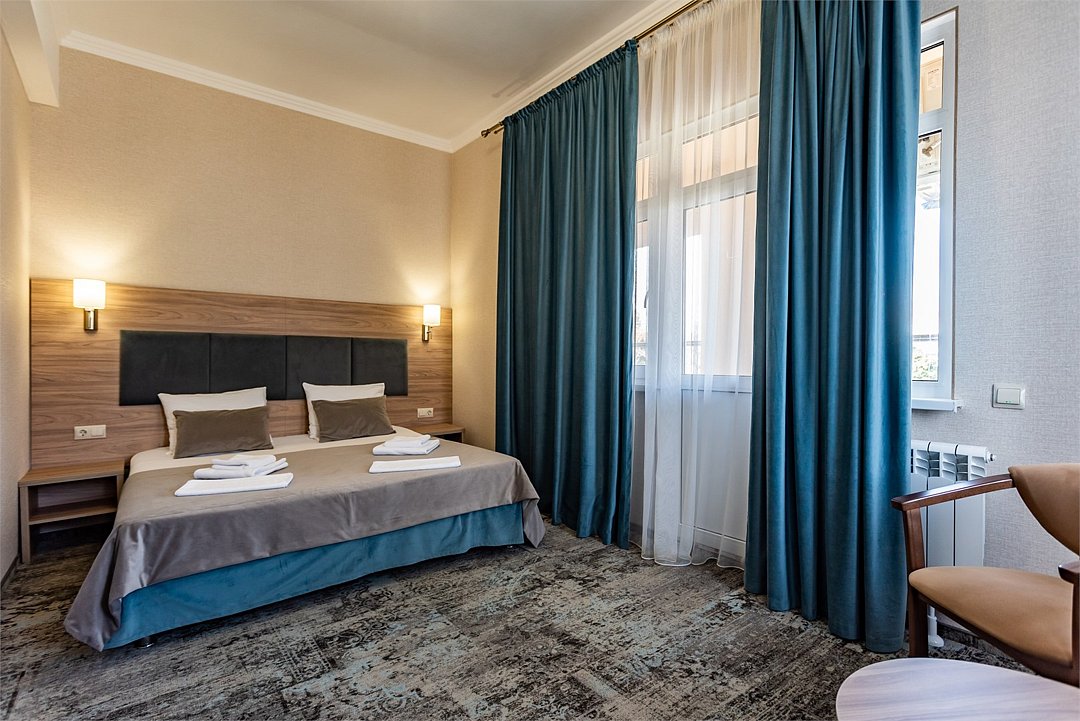 Двухкомнатный двухместный номер Стандарт площадью от 25 кв.м., с балконом. На основные места предоставлена двуспальная/две односпальные кровати. Одно дополнительное место на диване. В номере: зеркало, прикроватные тумбочки, стулья, холодильник, телевизор, система климат-контроль. Санузел с душевой кабиной, также имеются туалетные и банные принадлежности, фен.Услуги и удобства