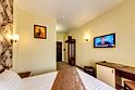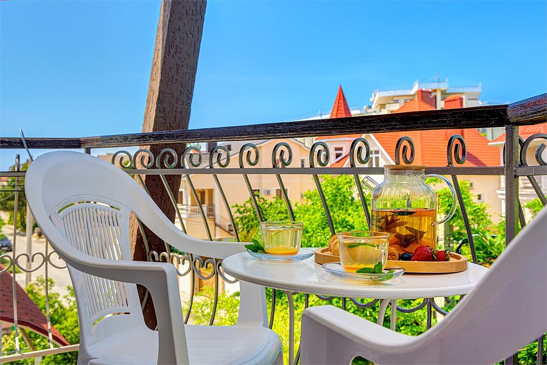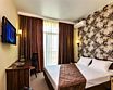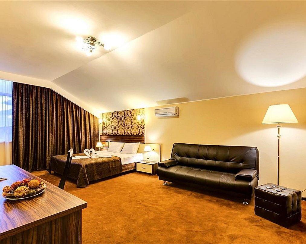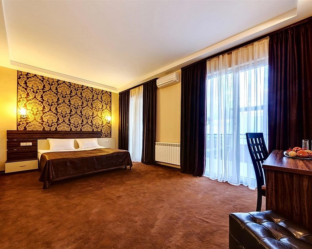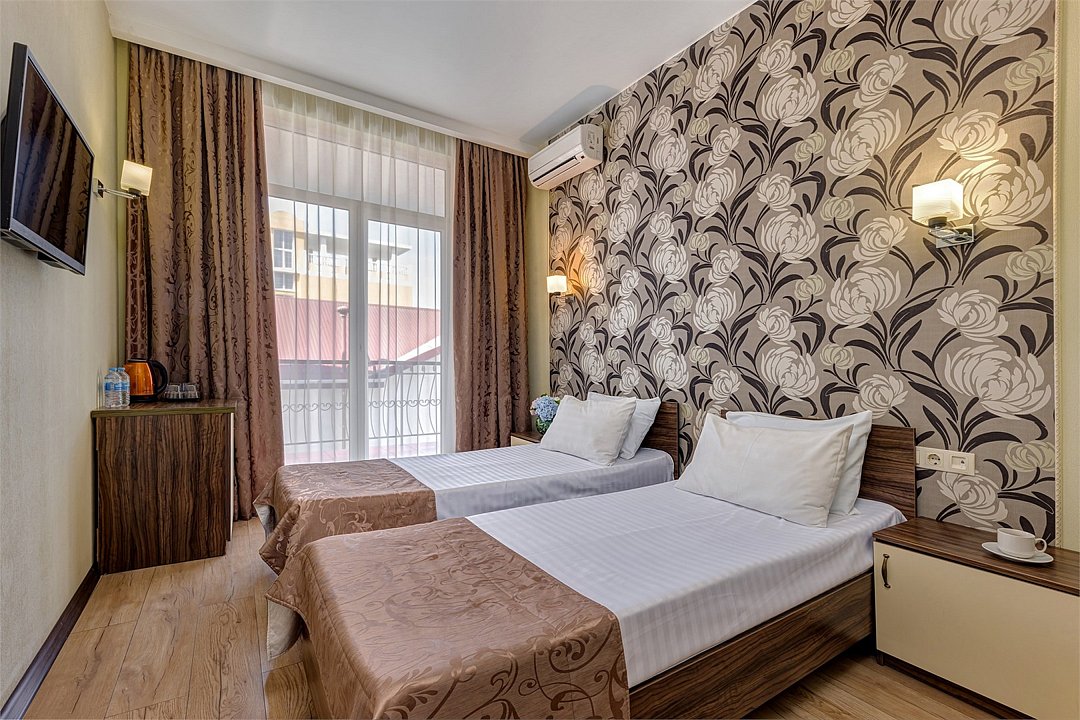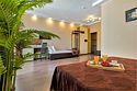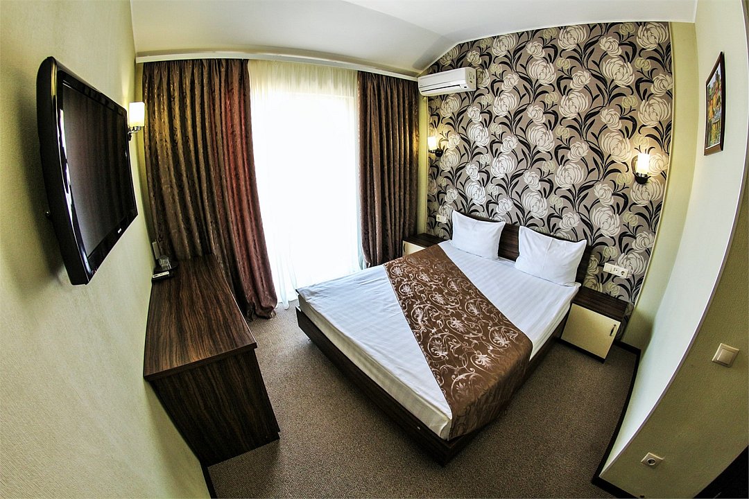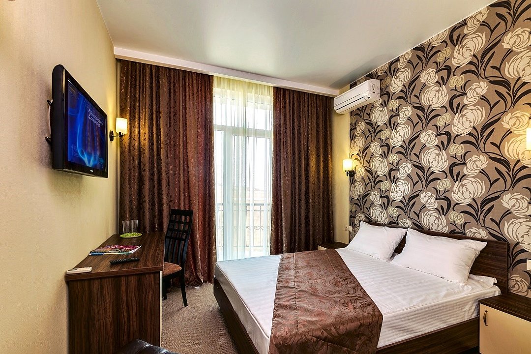 Однокомнатный номер, который представляет собой жилую комнату, рассчитанную на проживание одного-двух человек. Номер располагает одной большой кроватью. Также в некоторых номерах возможно разместить дополнительное место, евроласкладушку. Номер с балконами, на балконе установлена садовая мебель. Оформление номера в спокойных кофейно-фисташковых тонах позволит гостям окунуться в атмосферу расслабляющего и комфортного отдыха.Услуги и удобства