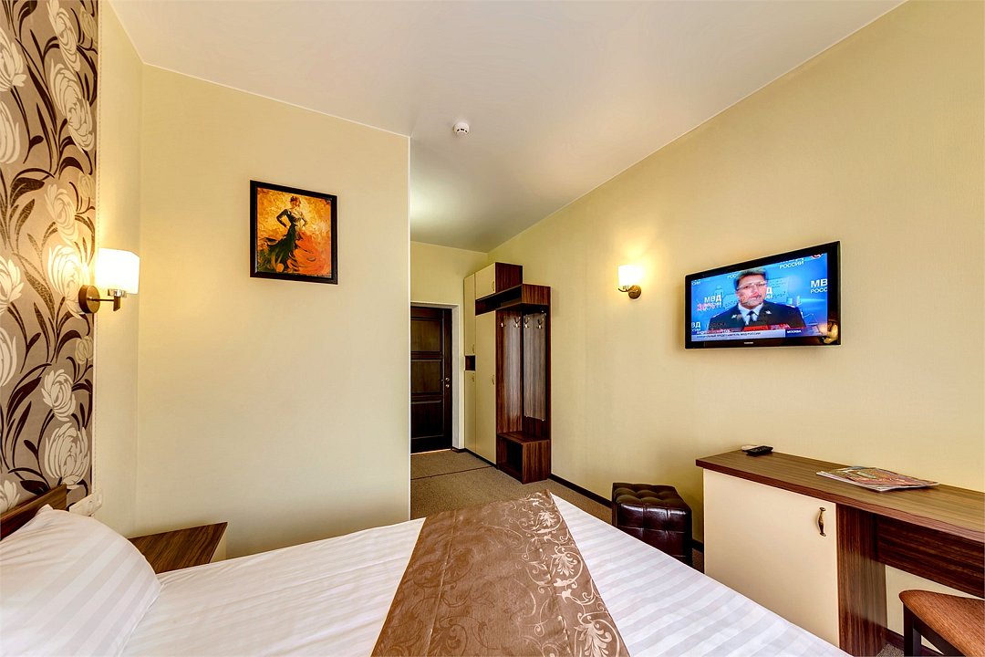 Однокомнатный номер, который представляет собой жилую комнату, рассчитанную на проживание одного человека. Номер располагает одной полутороспальной кроватью шириной 1,30 . Оформление номера в спокойных кофейно-фисташковых тонах позволит гостям окунуться в атмосферу расслабляющего и комфортного отдыха.Услуги и удобства