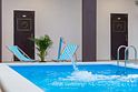 Открытый подогреваемый бассейн с шезлонгами и столиками.