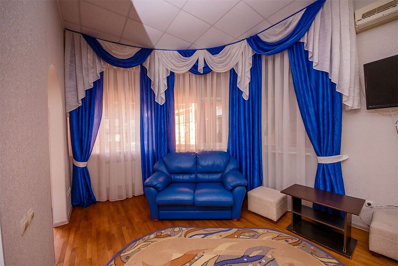 Оснащение номера - двуспальная кровать, раскладной диван, раскладное кресло, телевизор, сплит-система, холодильник, журнальный столик, зеркало, пуфики, прикроватные тумбы, шкаф-купе.