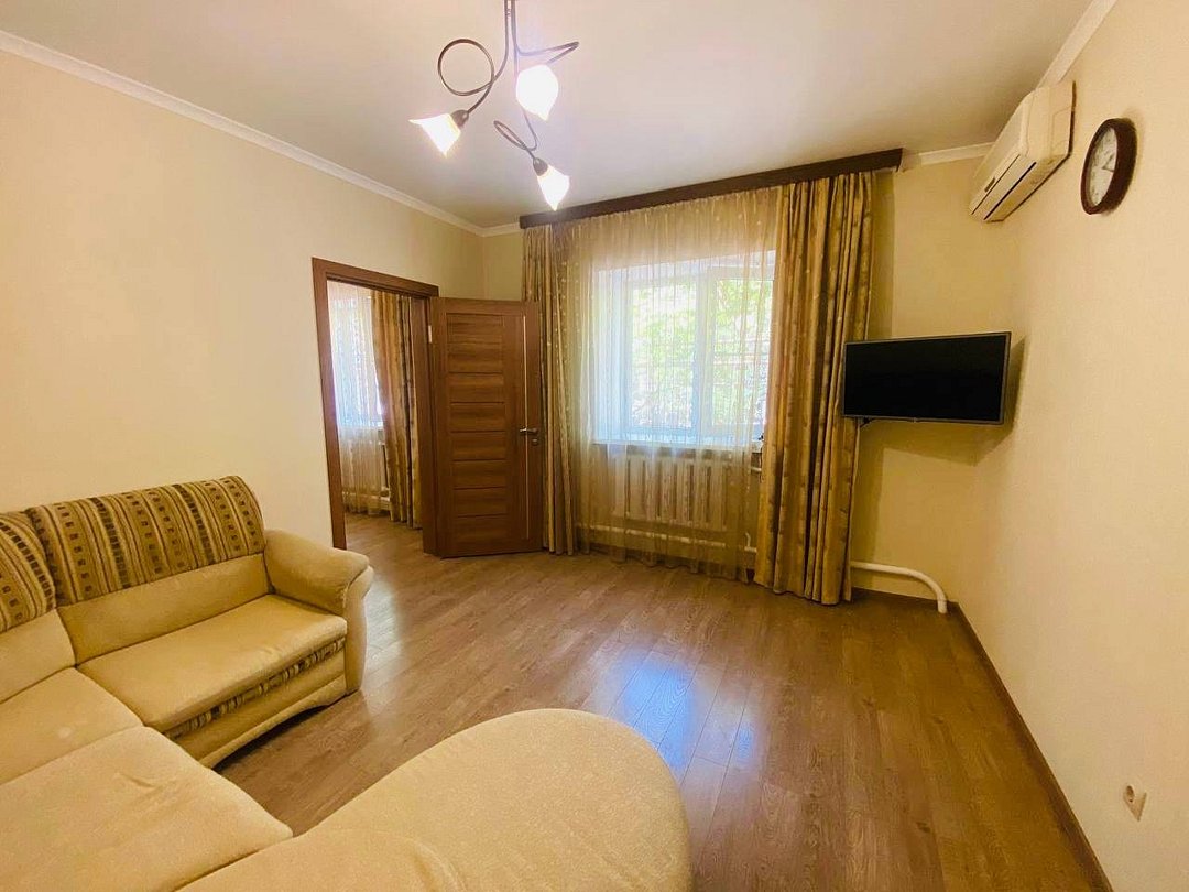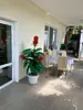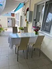 с отдельным входом и собственной террасой. В каждой комнате двуспальная кровать, раскладывающийся диван, шкаф для одежды, тумбочки, пуфик, журнальный столик, обеденный стол со стульями, телевизор, кондиционер, холодильник, фен, современный санузел с душем