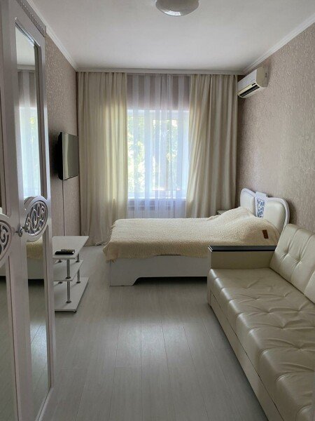 22м2, Двуспальная кровать, раскладывающийся диван, шкаф для одежды, тумбочки, пуфик, журнальный столик, телевизор, кондиционер, холодильник, фен, гигиенические принадлежности, халаты, тапочки, современный санузел с душем в номере.