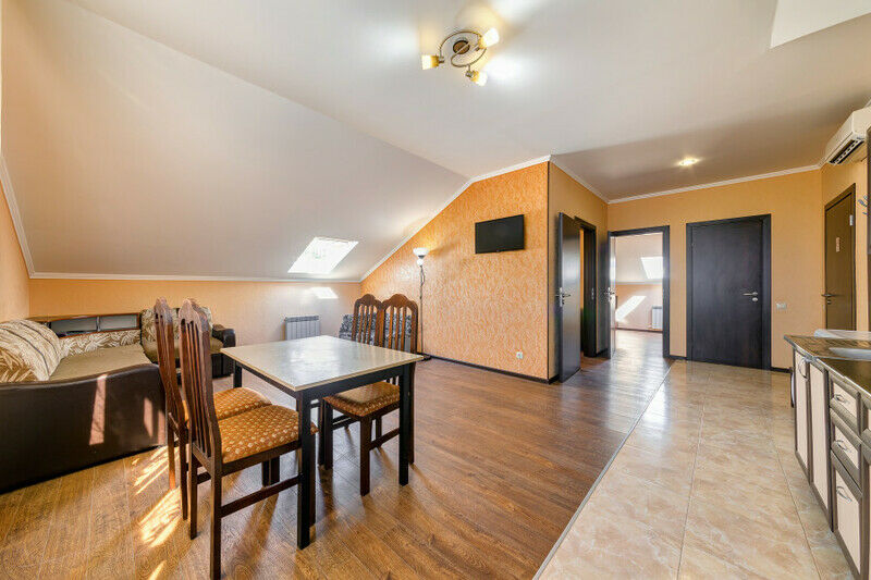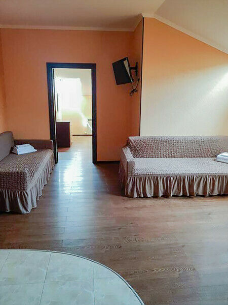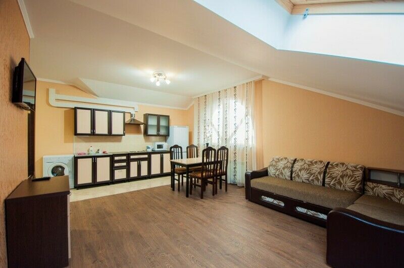 Кровать двуспальная, три дивана, тумбочки прикроватные, рабочий стол, холодильник, кондиционер, телевизор, стиральная машина, КУХНЯ, санузел (душ+туалет)