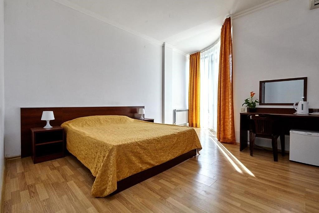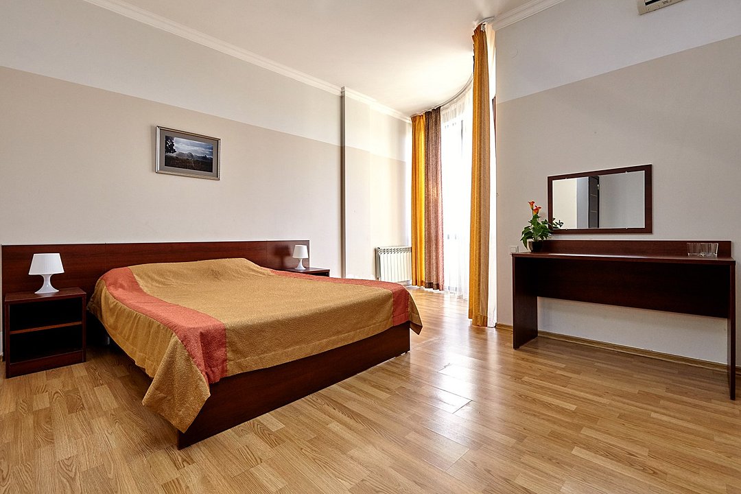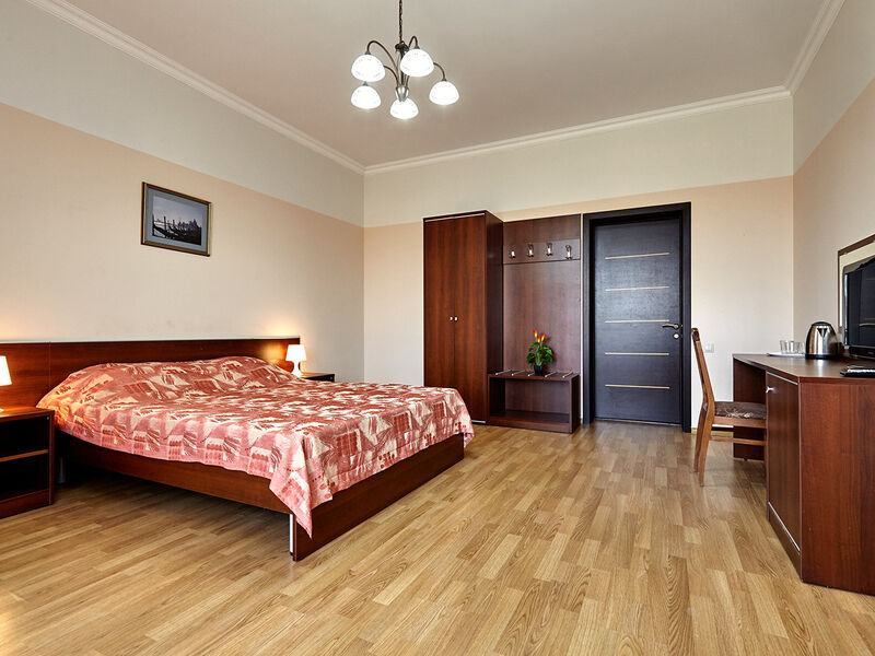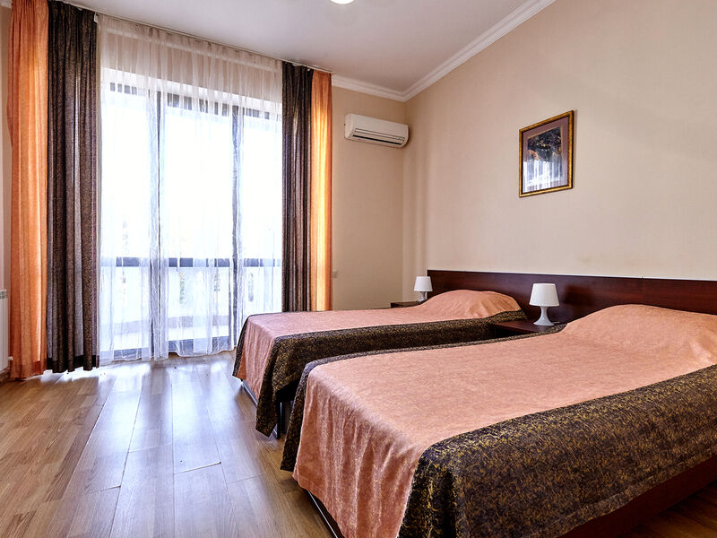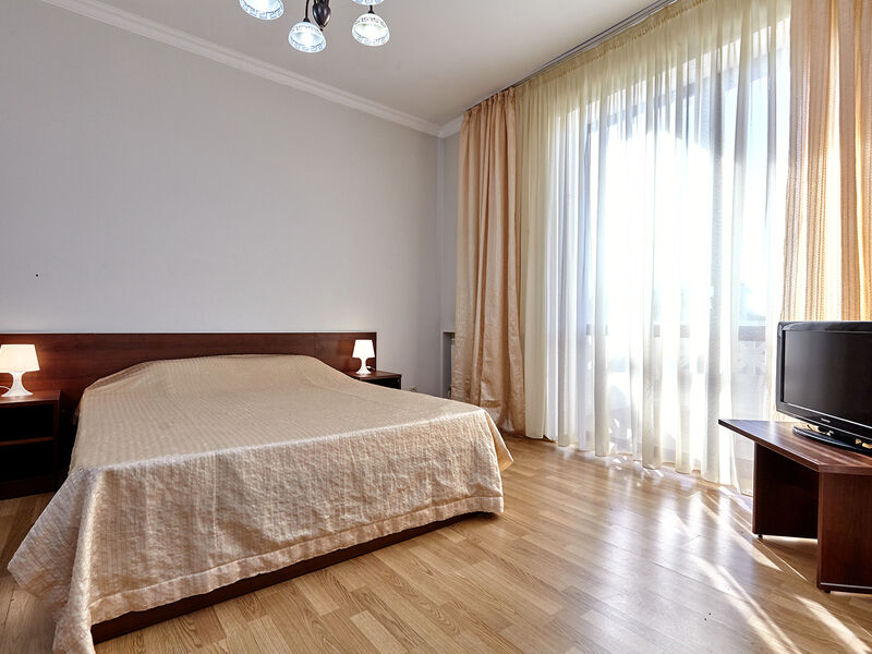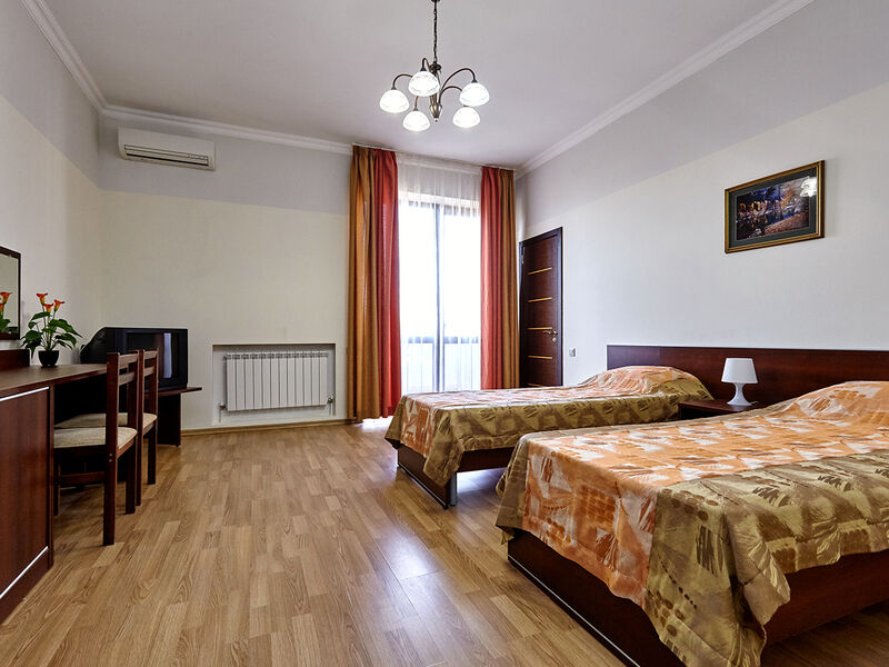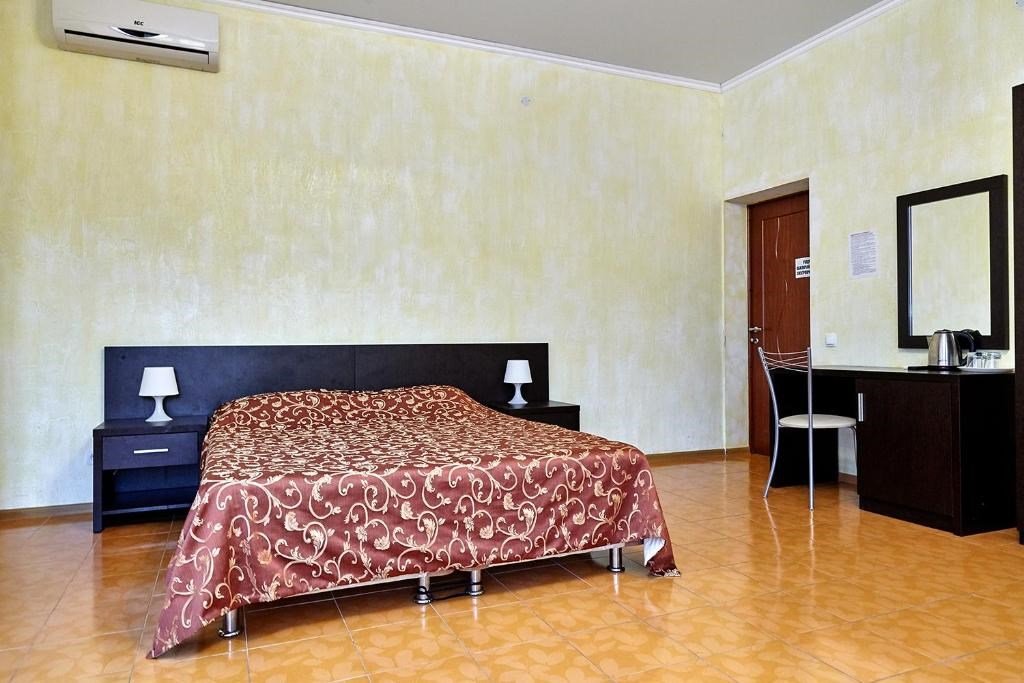 Номера с удобствами оборудованы всем необходимым для комфортного отдыха. Две односпальные или одна двухспальная кровать.В каждом номере сплит-система, телевизор с плоским экраном, холодильник, электрочайник, набор посуды, фен, собственная ванная комната с душем, зеркало, стол и стулья, 2 тумбочки, шкаф, набор полотенец, балкон.Услуги и удобства