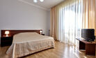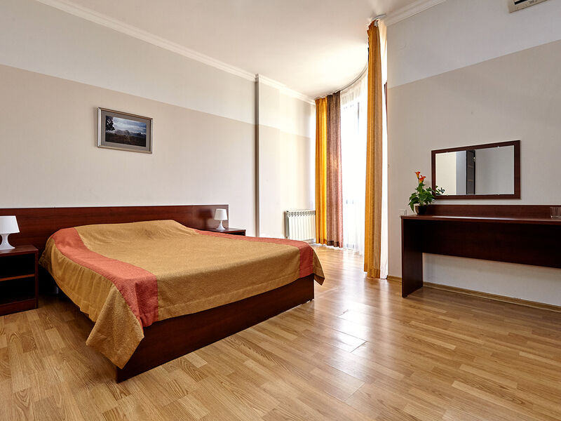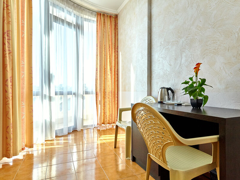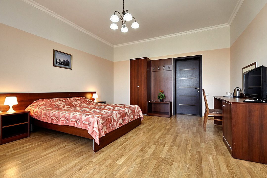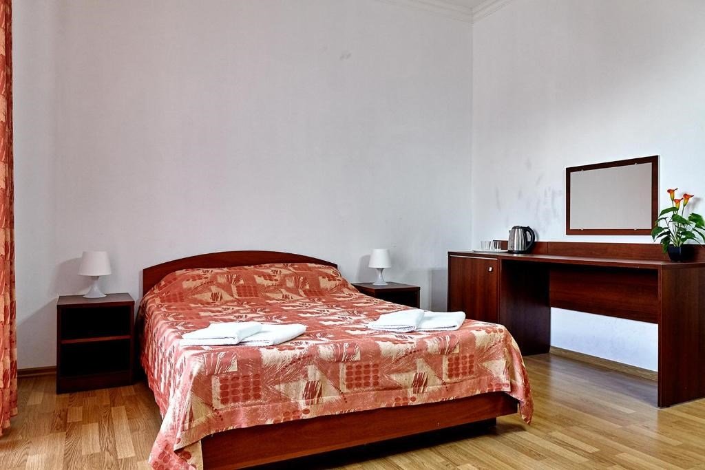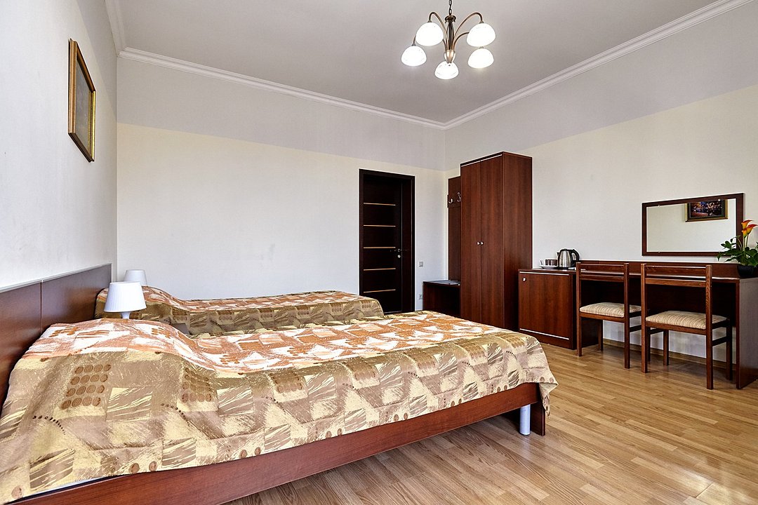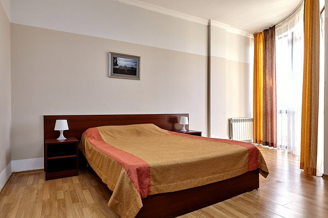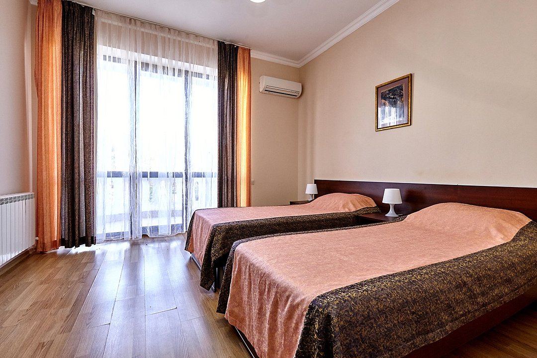 Номера с удобствами оборудованы всем необходимым для комфортного отдыха. Две односпальные или одна двухспальная кровать.В каждом номере сплит-система, телевизор с плоским экраном, холодильник, электрочайник, набор посуды, фен, собственная ванная комната с душем, зеркало, стол и стулья, 2 тумбочки, шкаф, набор полотенец, балкон.Услуги и удобства