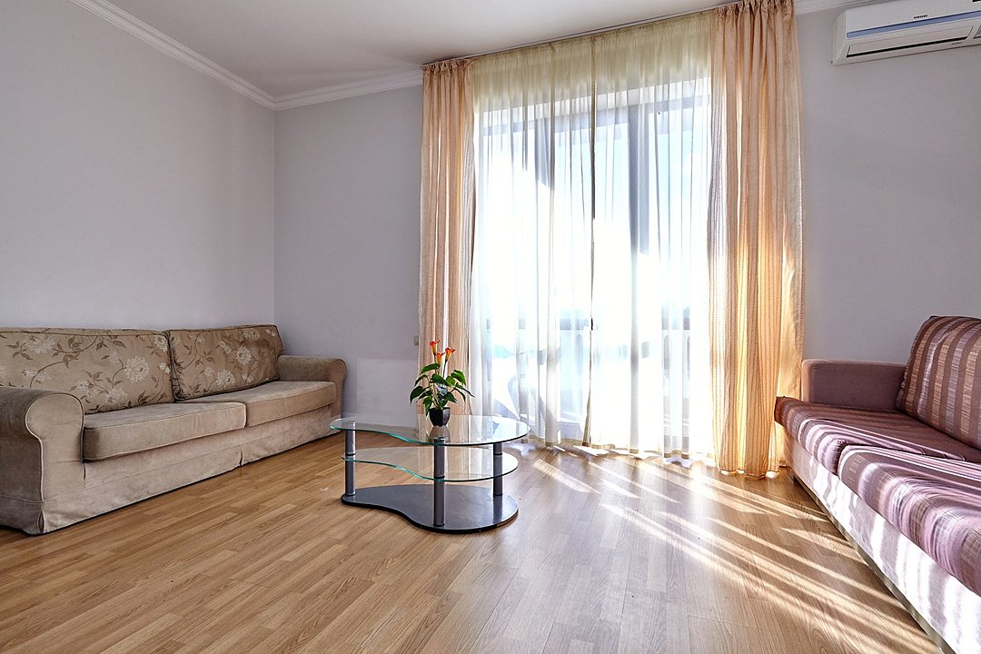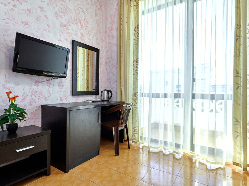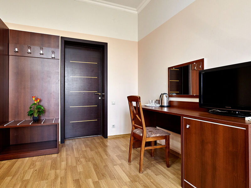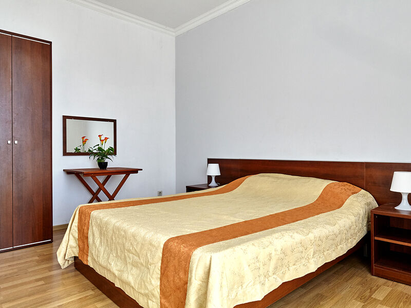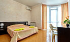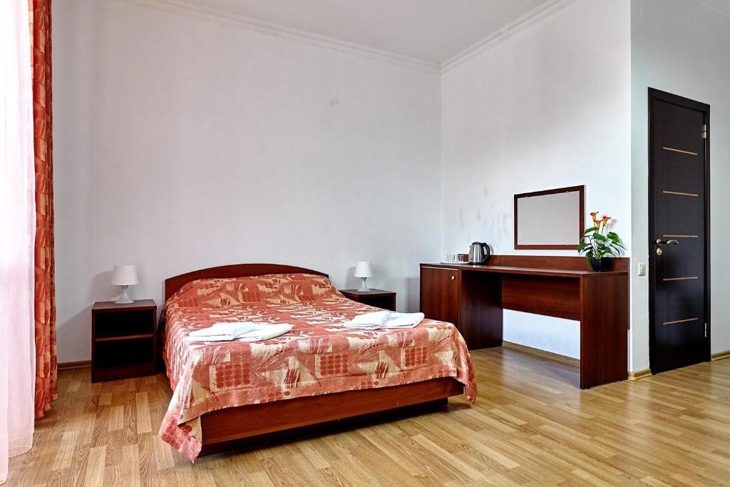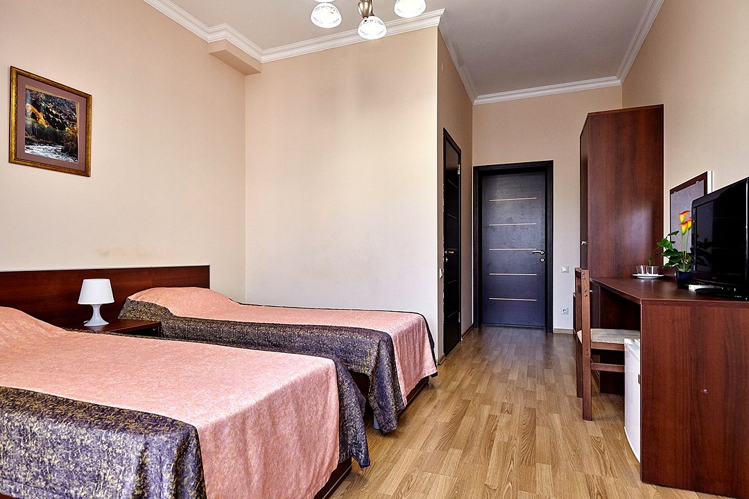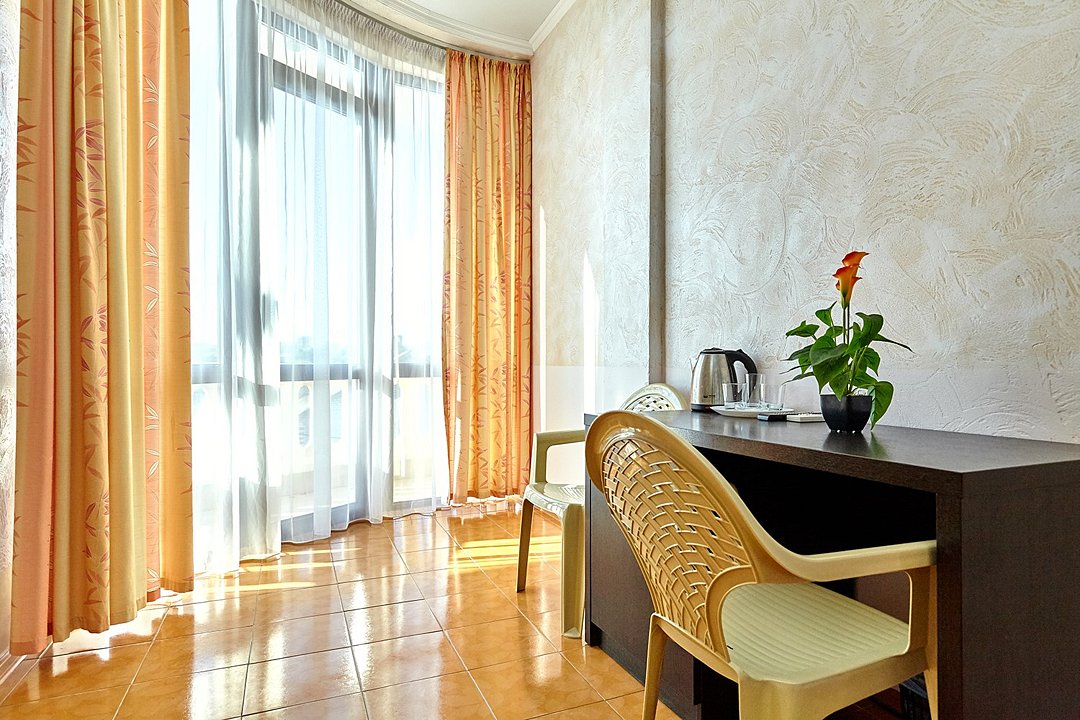 Номера с удобствами оборудованы всем необходимым для комфортного отдыха. Две односпальные или одна двухспальная кровать.В каждом номере сплит-система, телевизор с плоским экраном, холодильник, электрочайник, набор посуды, фен, собственная ванная комната с душем, зеркало, стол и стулья, 2 тумбочки, шкаф, набор полотенец, балкон.Услуги и удобства