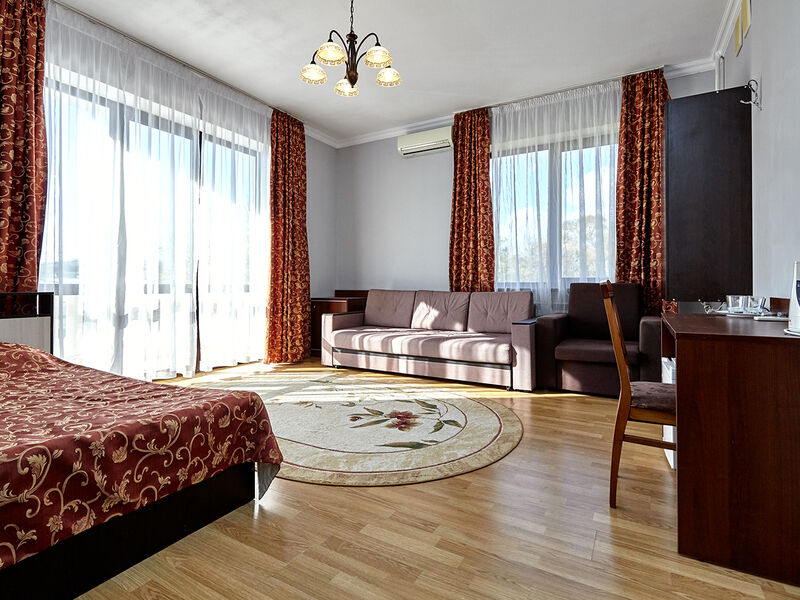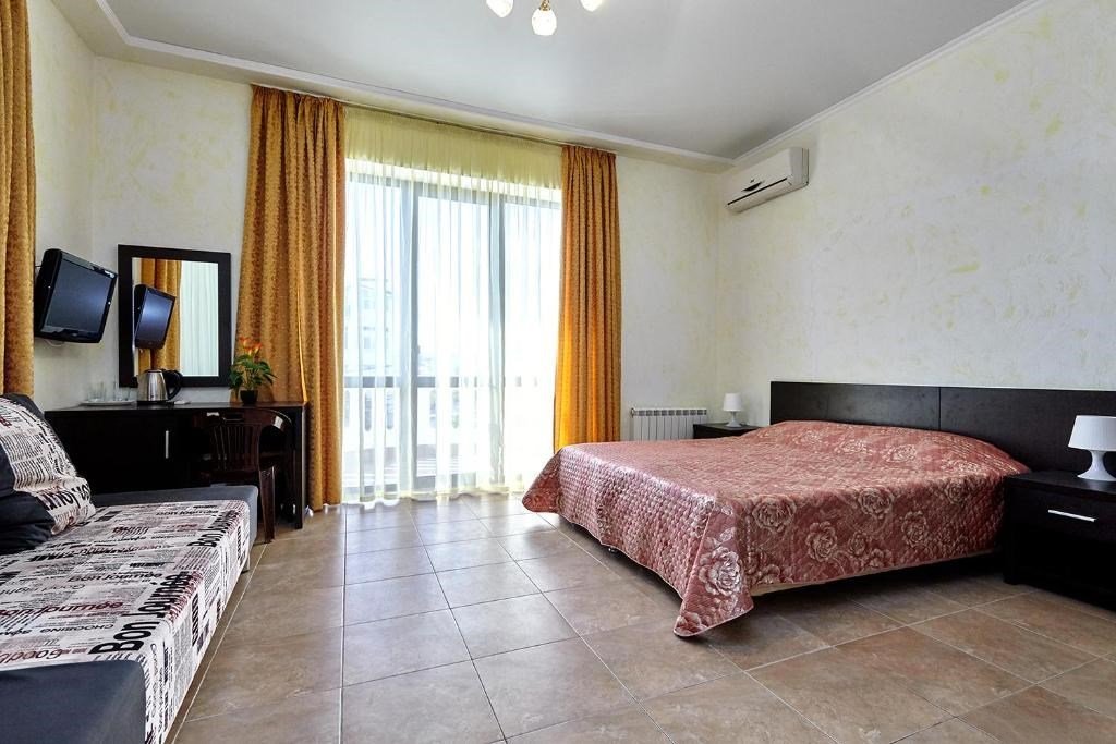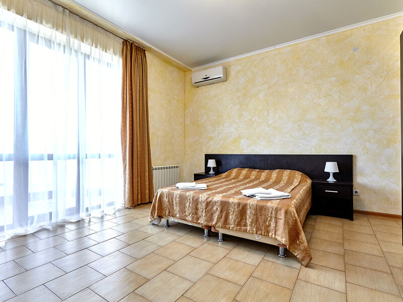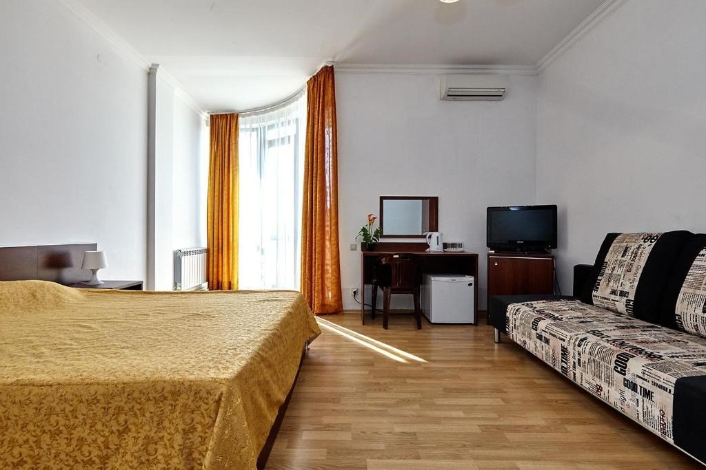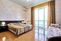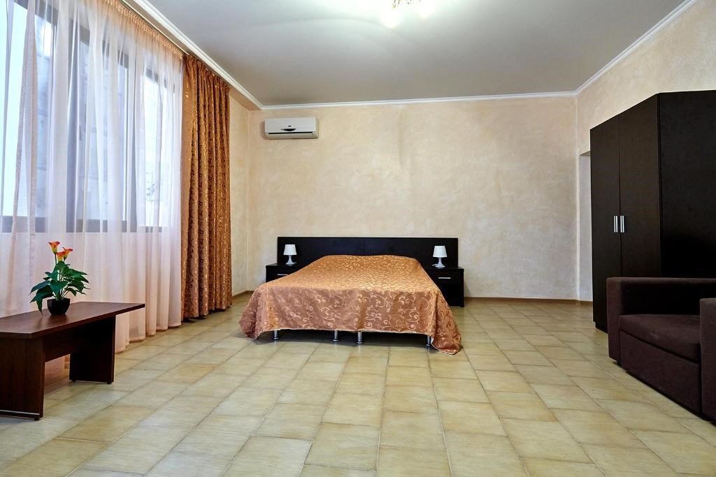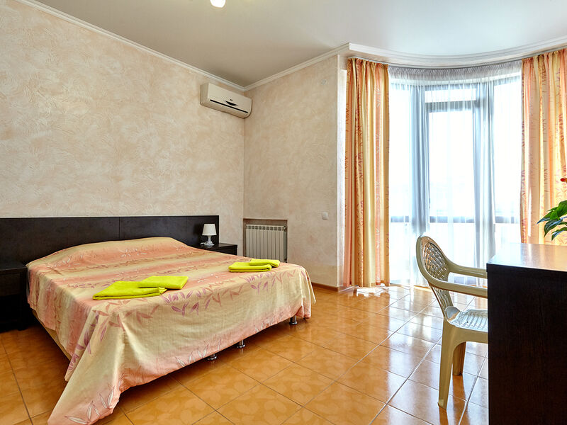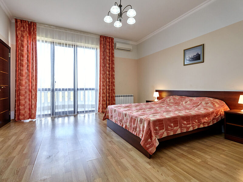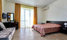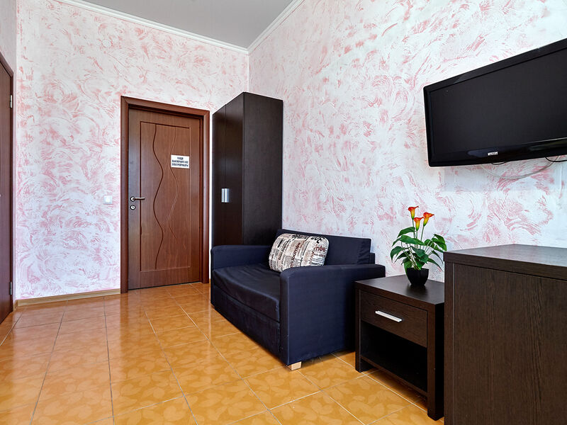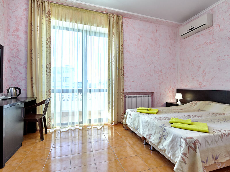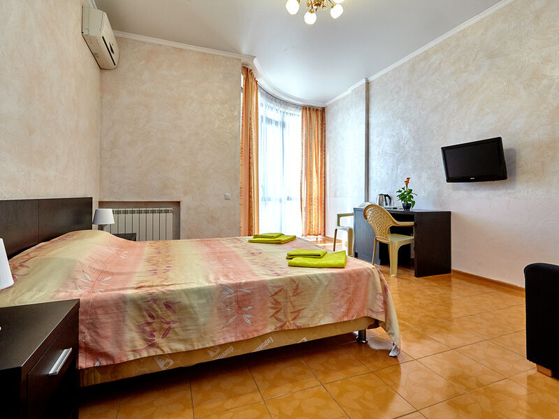 Номера с удобствами оборудованы всем необходимым для комфортного отдыха. Двухспальная кровать и два односпальных дивана.В каждом номере сплит-система, телевизор с плоским экраном,холодильник,электрочайник,набор посуды,фен,собственная ванная комната с душем,зеркало,,стол и стулья,2 тумбочки,шкаф,набор полотенец,2 балкона.Услуги и удобства