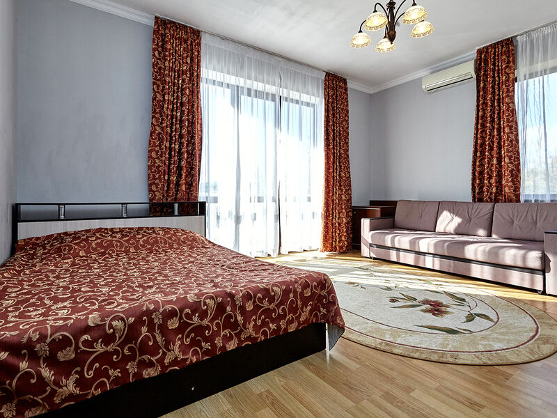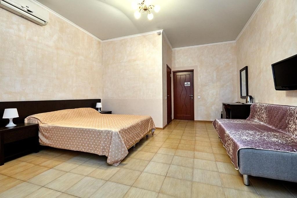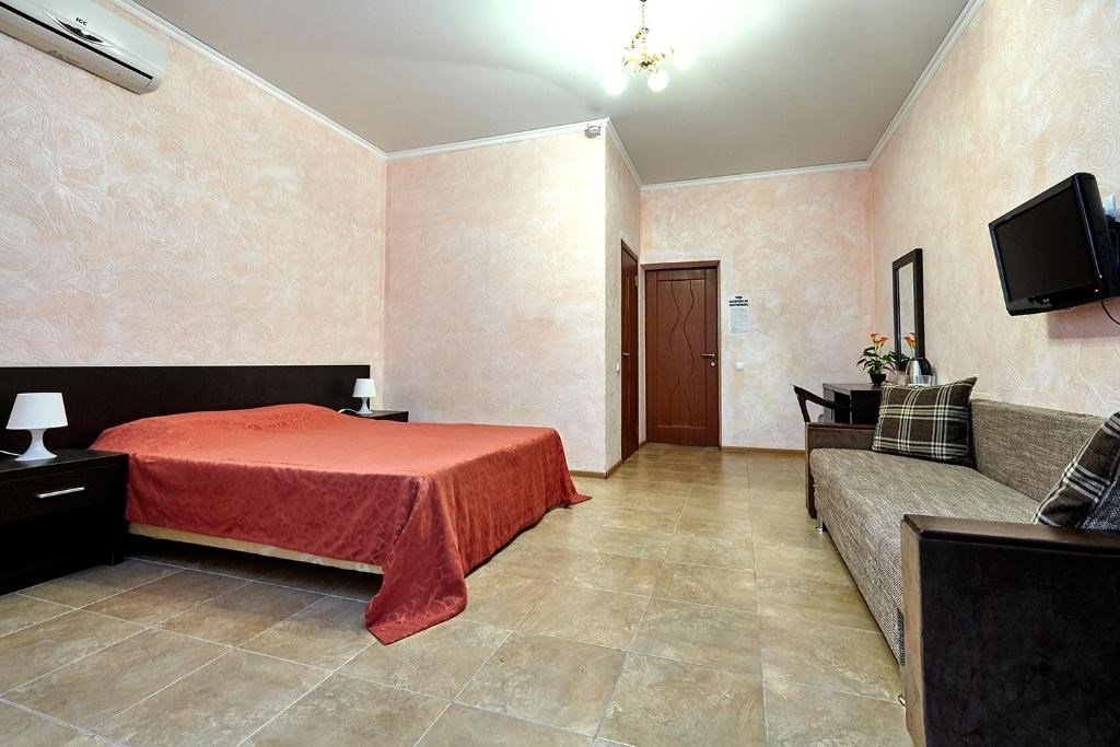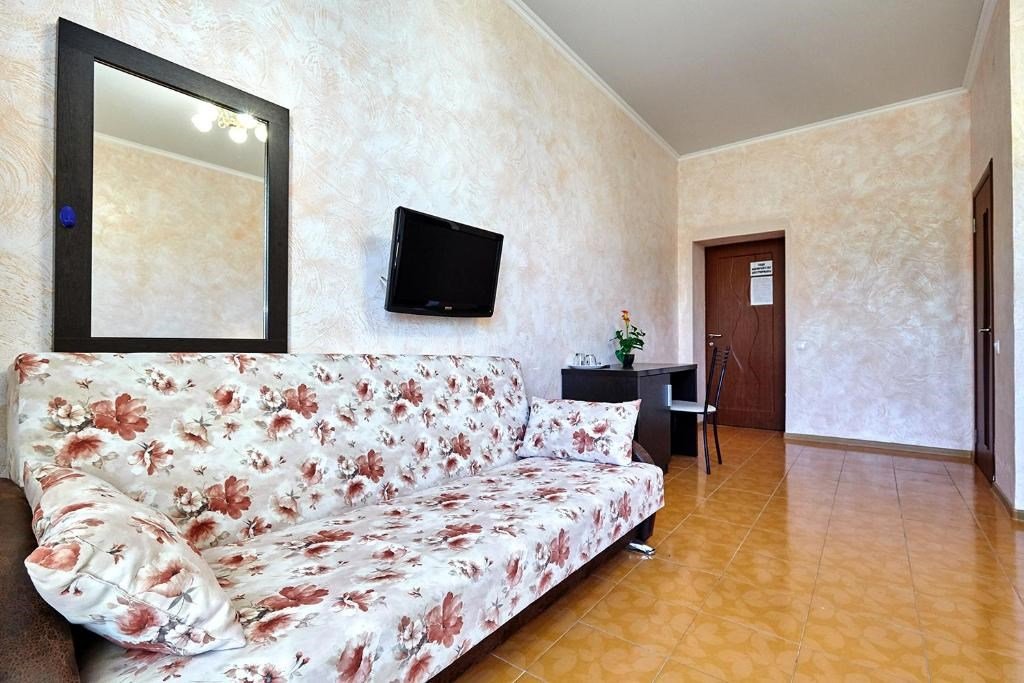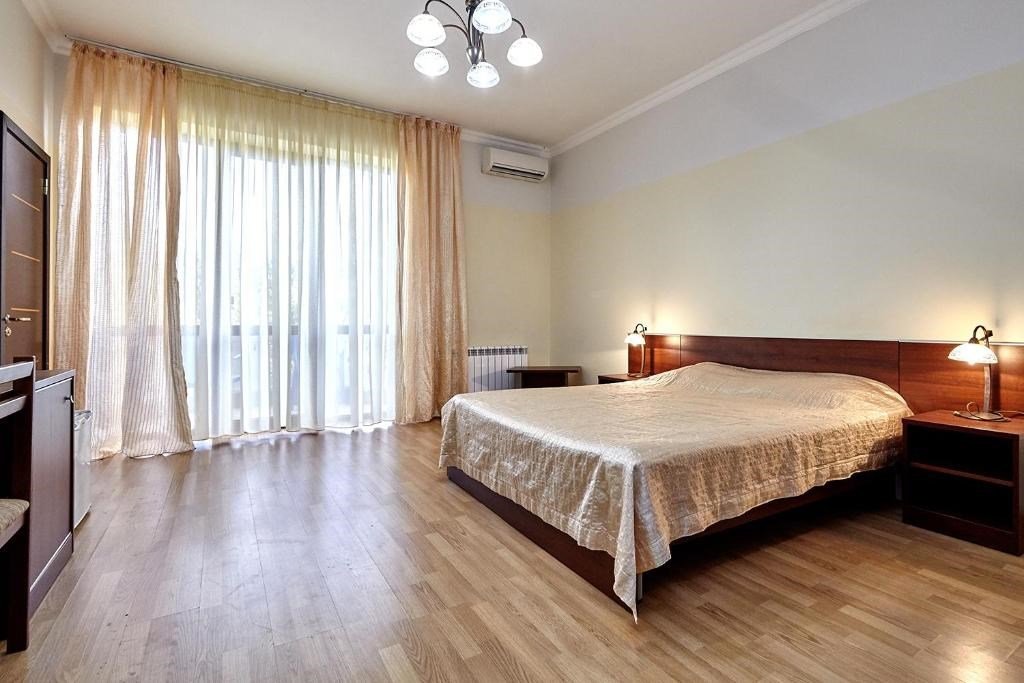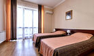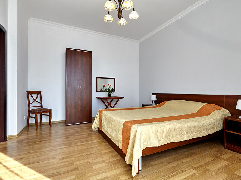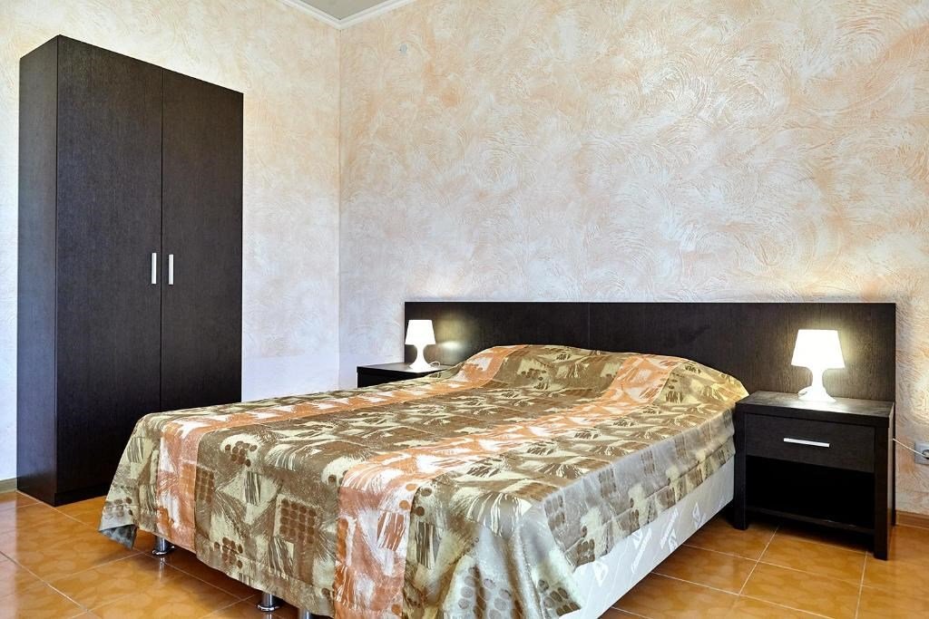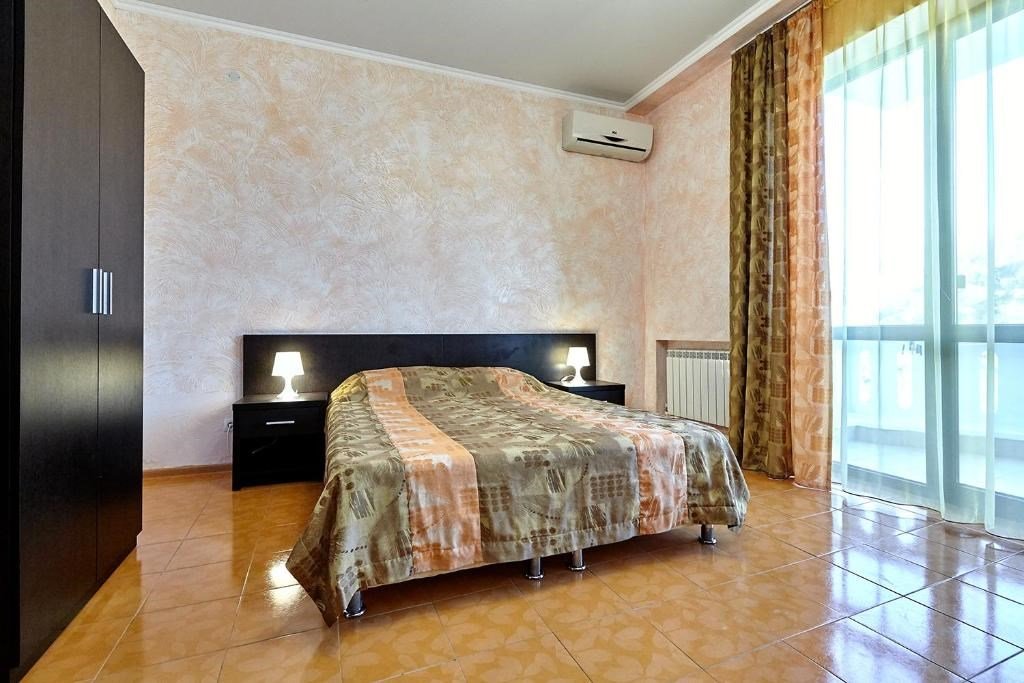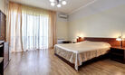 Номера с удобствами оборудованы всем необходимым для комфортного отдыха. Двухспальная кровать и два односпальных дивана.В каждом номере сплит-система, телевизор с плоским экраном,холодильник,электрочайник,набор посуды,фен,собственная ванная комната с душем,зеркало,,стол и стулья,2 тумбочки,шкаф,набор полотенец,2 балкона.Услуги и удобства