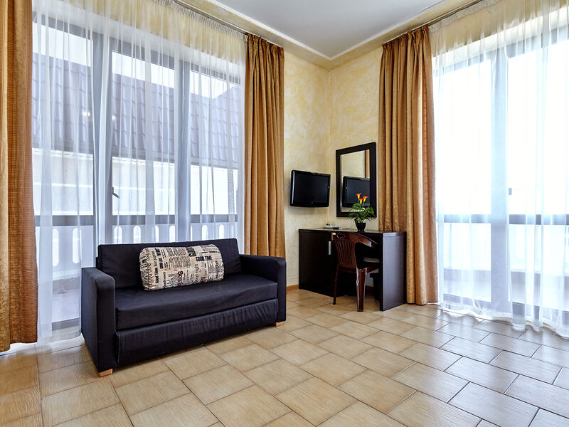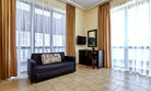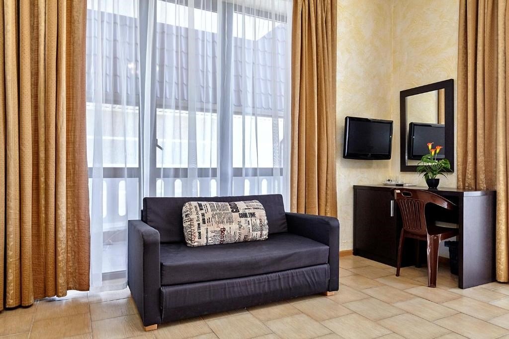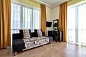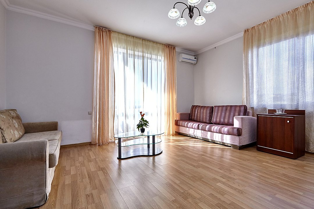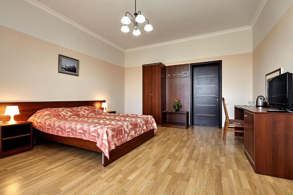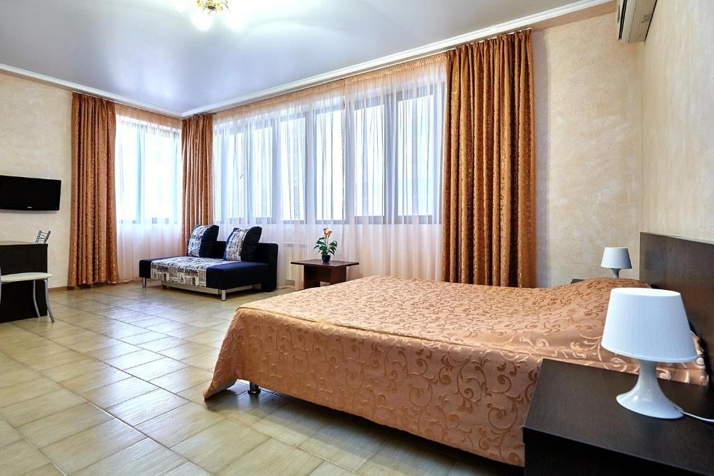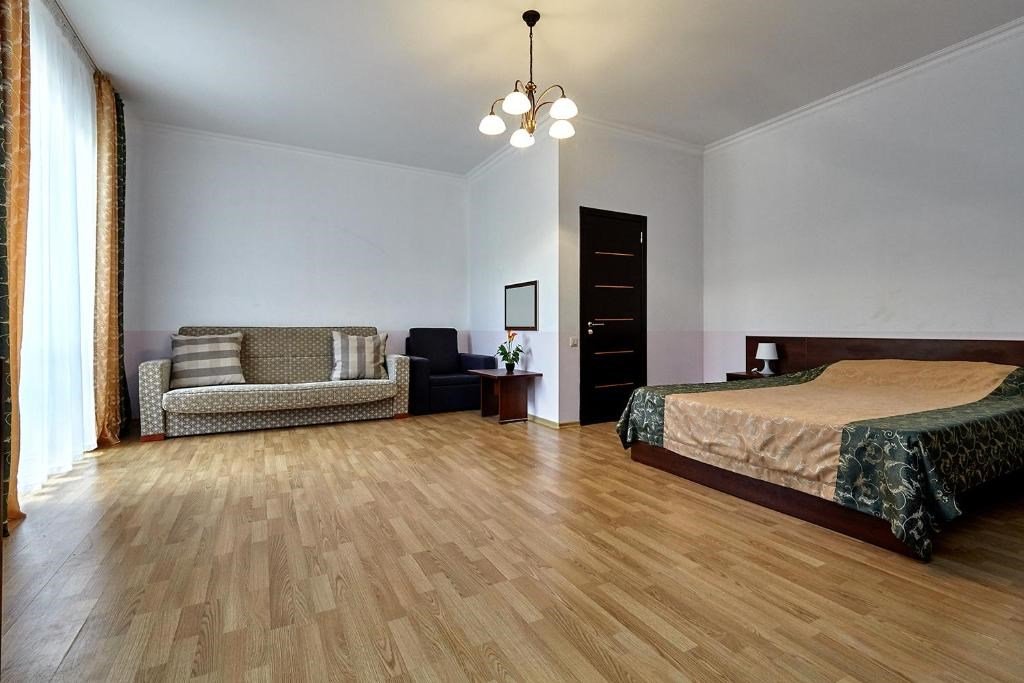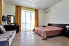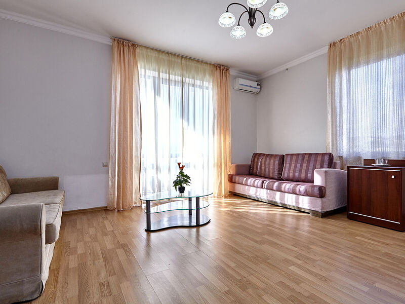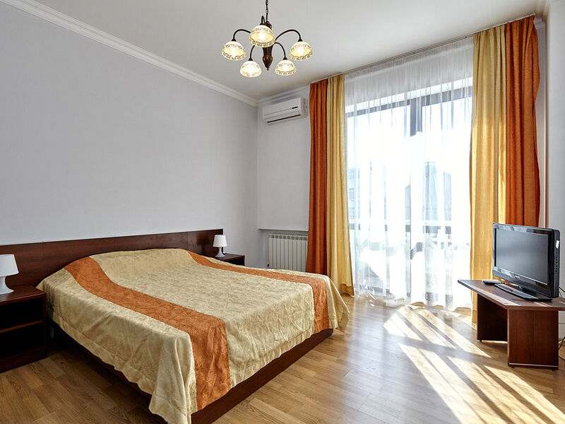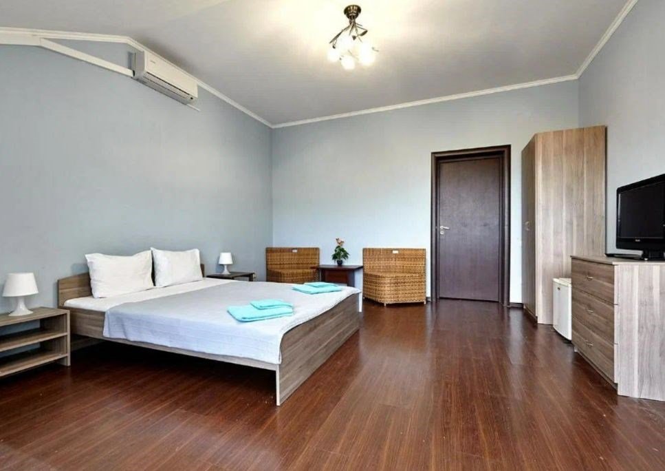 Номера с удобствами оборудованы всем необходимым для комфортного отдыха. Двухспальная кровать и два односпальных дивана.В каждом номере сплит-система, телевизор с плоским экраном,холодильник,электрочайник,набор посуды,фен,собственная ванная комната с душем,зеркало,,стол и стулья,2 тумбочки,шкаф,набор полотенец,2 балкона.Услуги и удобства