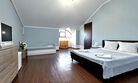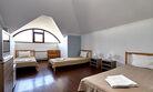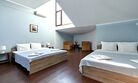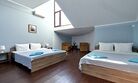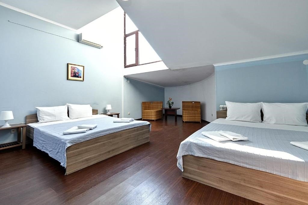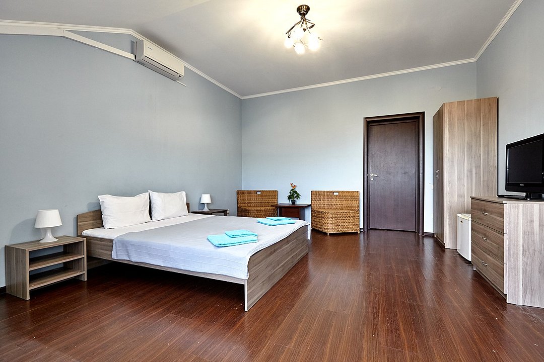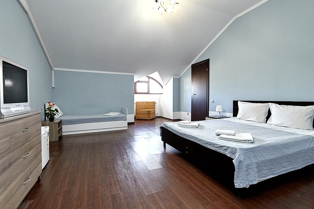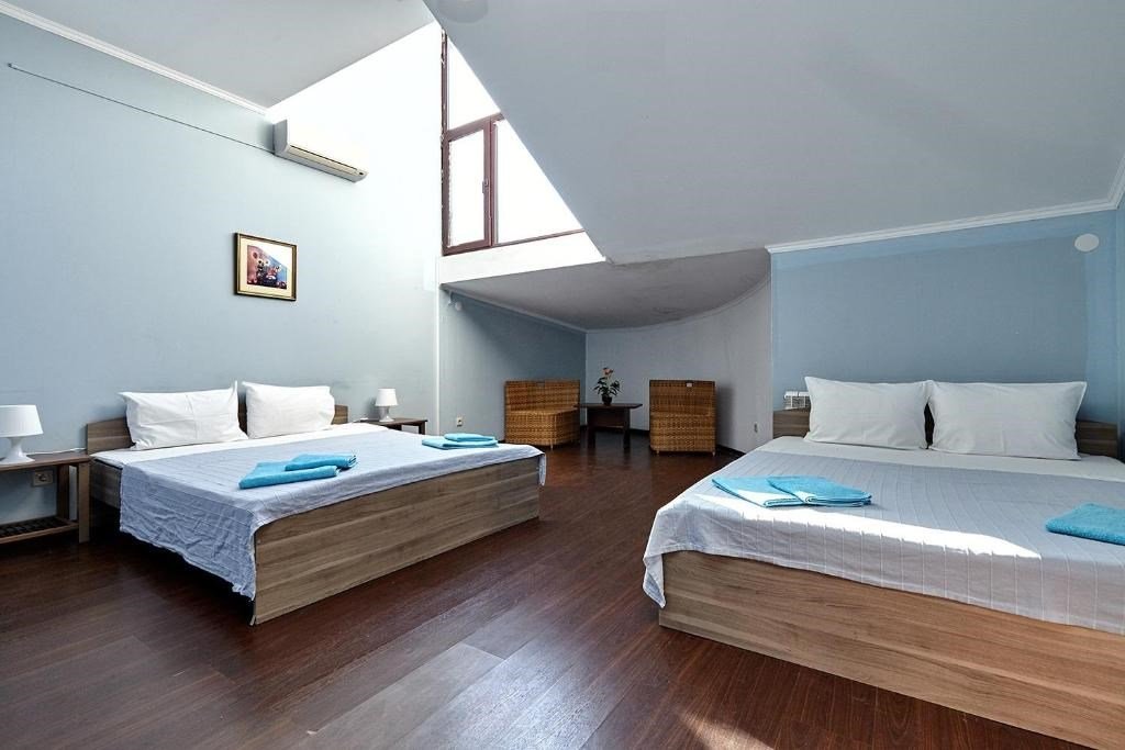 Номера с удобствами оборудованы всем необходимым для комфортного отдыха. Две двухспальные и две односпальные кровати. В каждом номере сплит-система, телевизор с плоским экраном, холодильник, электрочайник, набор посуды, фен, собственная ванная комната с душем, зеркало, стол и стулья, 2 тумбочки, шкаф, набор полотенец. Внимание: мансардный номерУслуги и удобства