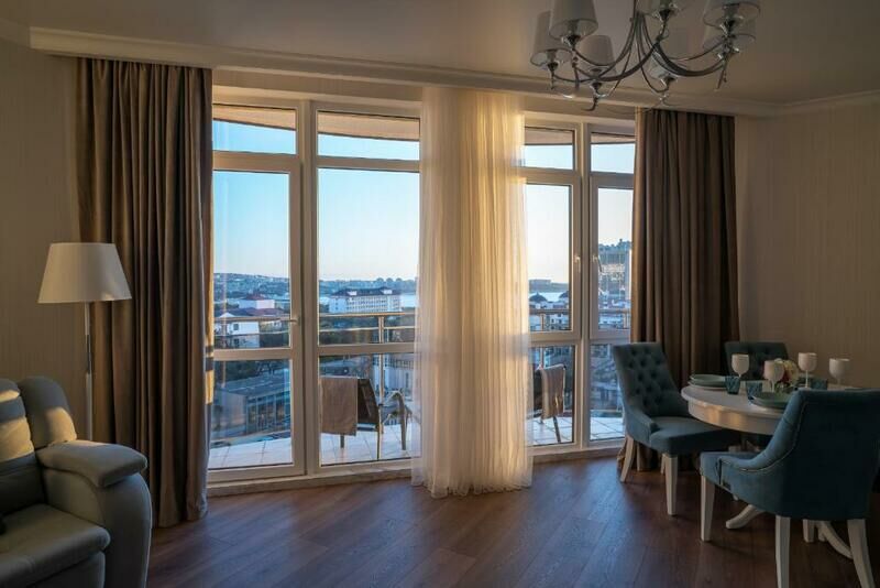 В 500 метрах от Апартаментов находится городской оборудованный пляж: на галечном побережье установлены навесы от солнца, раздевалки, есть шезлонги и зонтики.