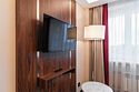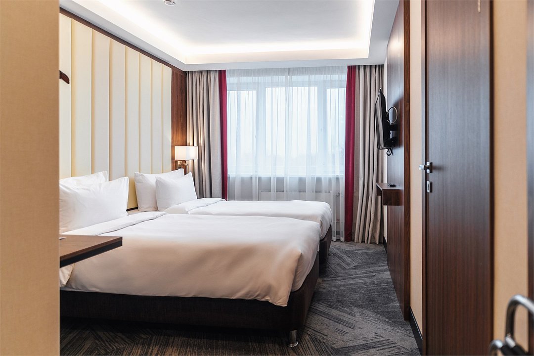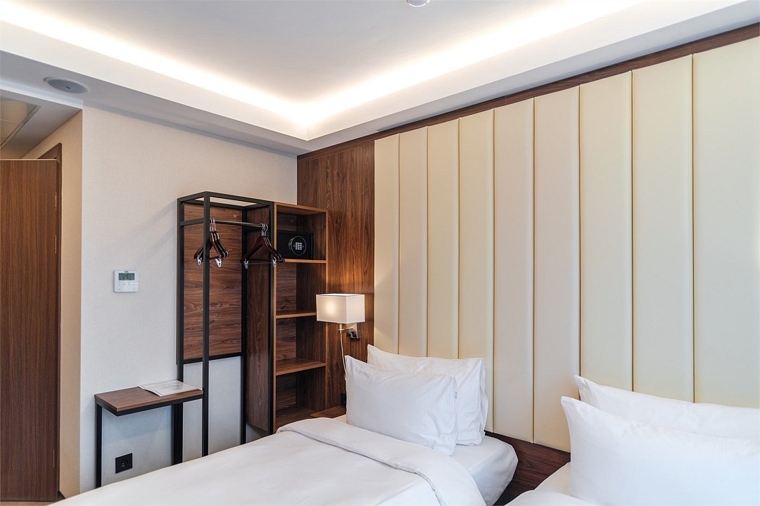 Wi-Fi, интернет, телефон, светильник, электронные замки, ванная комната, душевая кабина, санузел, банные полотенца, тапочки, гигиенические средства, косметические средства, две односпальные кровати, шкаф для одежды, вешалки, зеркало, пуфики, ковер, звуконепроницаемые стены и окна, сейф, унитаз, косметическое зеркало, питьевая вода, ковровое покрытие, отопление, душ, вид на город, вид во двор, стаканы, туалет, внутренний телефон, телевизор со Smart TVВ номере