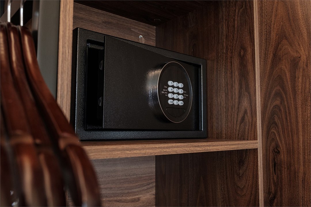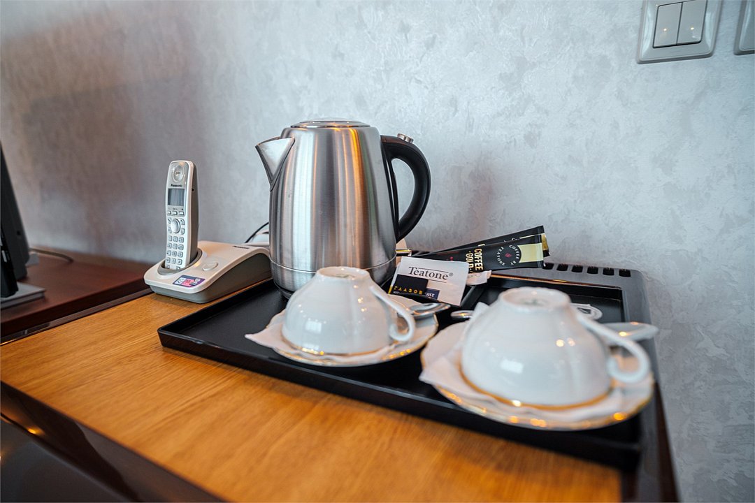 два телевизора, Wi-Fi, интернет, телефон, система климат-контроля, светильник, настольные лампы, фен, электронные замки, кофемашина, утюг, ванная комната, ванна, санузел, дополнительный санузел, биде, халаты, банные полотенца, тапочки, кровать «King size», гладильная доска, диван, кресла, стулья, шкаф для одежды, гардеробная, вешалки, журнальный столик, письменный стол, обеденный стол, зеркало, пуфики, мебельный гарнитур, две комнаты, звуконепроницаемые стены и окна, обслуживание номеров, сейф, минеральная вода, чайник, унитаз, мягкая мебель, косметическое зеркало, питьевая вода, гостиная зона, душ, кресло, вид во двор, стаканы, кофейный столик, стул, тумба, туалетный столик, туалетные средства, туалет, внутренний телефон, мини-холодильник, телевизор со Smart TV, номер для некурящихВ номере
