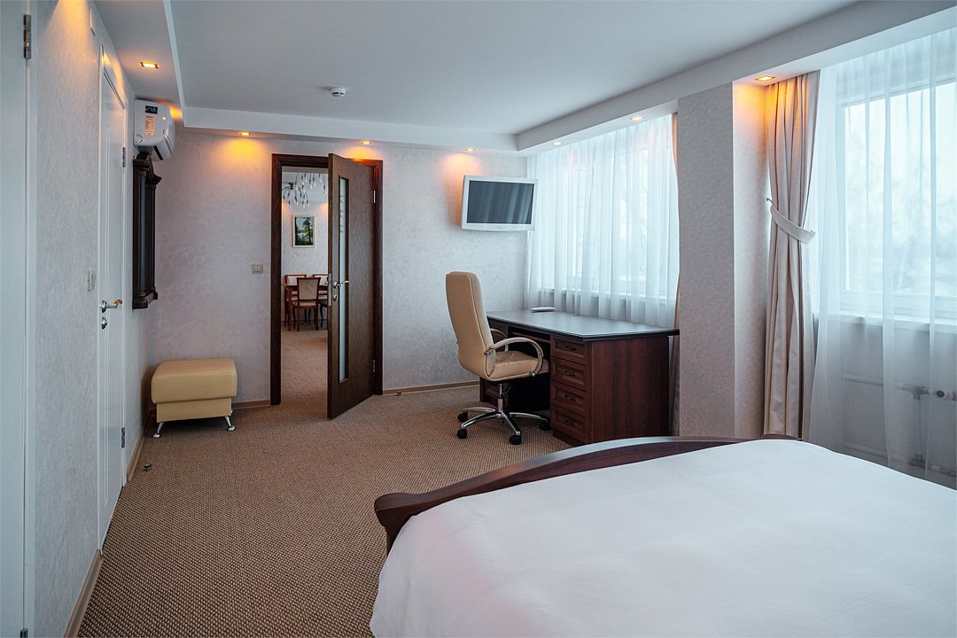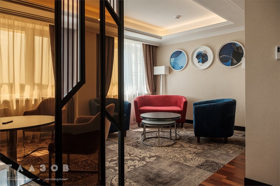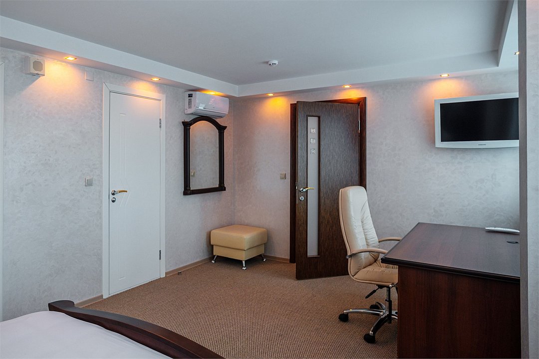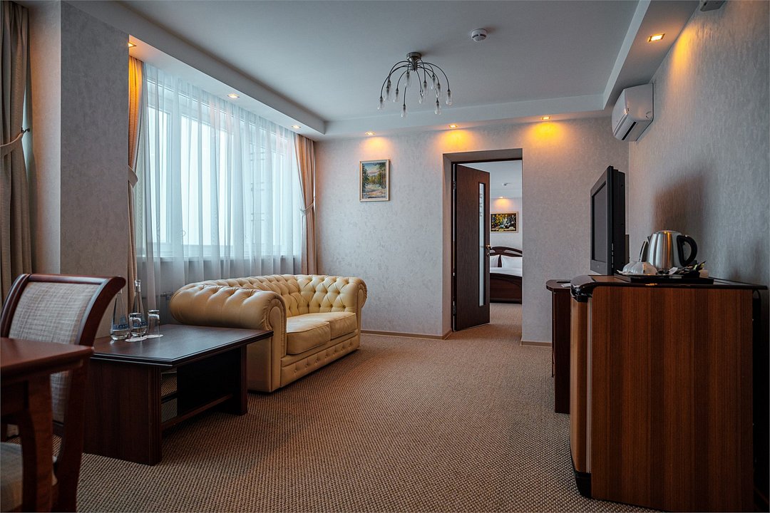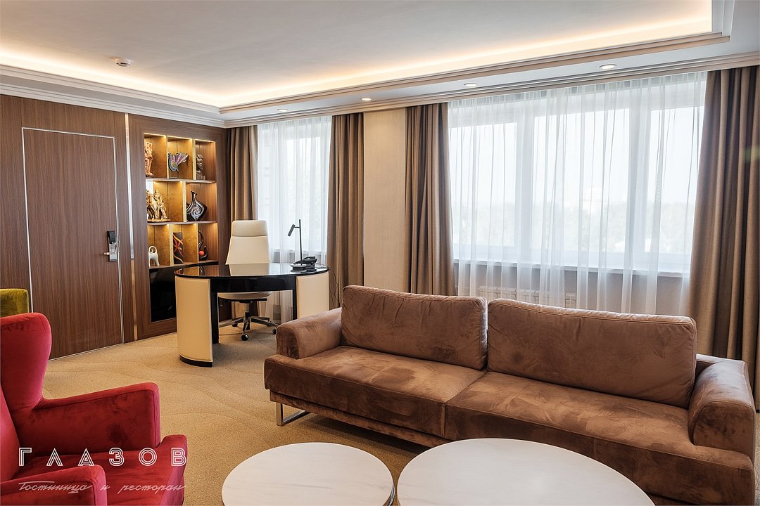 Роскошные апартаменты для проживания в условиях повышенного комфорта. Эксклюзивный дизайн погрузит в неповторимую атмосферу стиля и комфорта. Просторный номер состоит из гостиной, спальни, гардеробной и двух комнат гигиены. Номер отвечает всем современным требованиям и оборудован системой климат контроля, двумя телевизорами, сейфом, Wi-Fi. В номере два санузла: гостевой и основной с ванной и душевой кабиной. VIP – отличный выбор для деловых поездок и комфортного отдыха. В стоимость номера входит завтрак по системе «шведский стол» и доступ в лаунж клубного этажа, зону отдыха, бесед, общения с коллегами, друзьями, семьей.Услуги и удобства