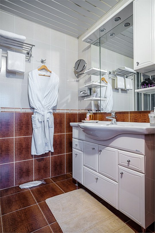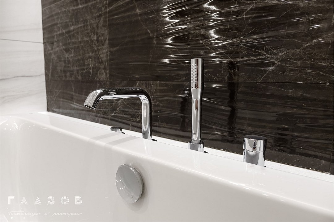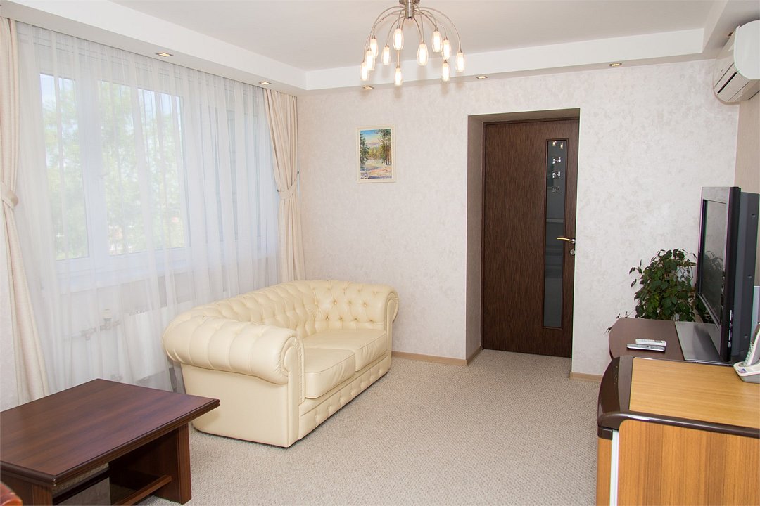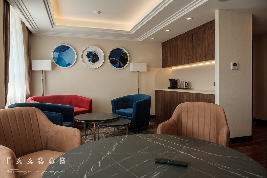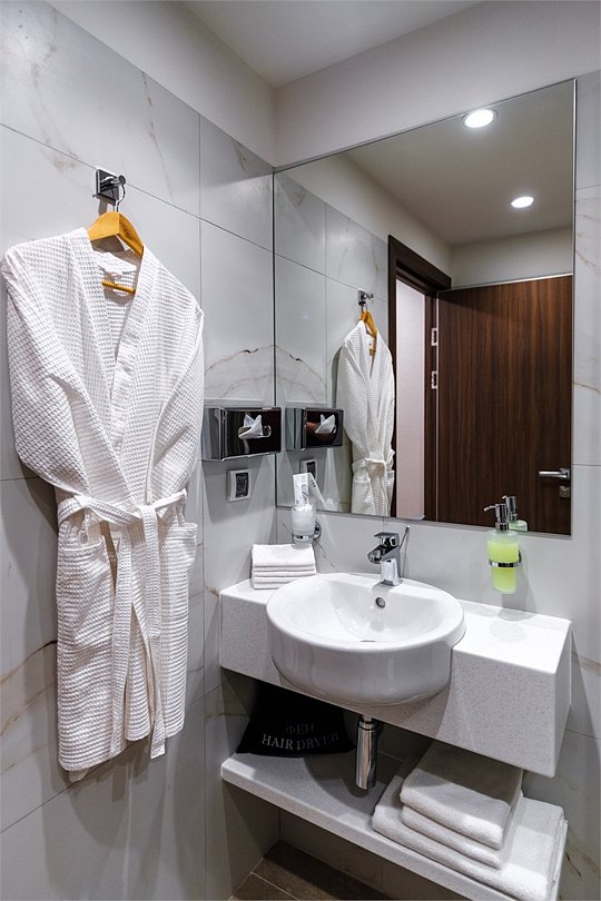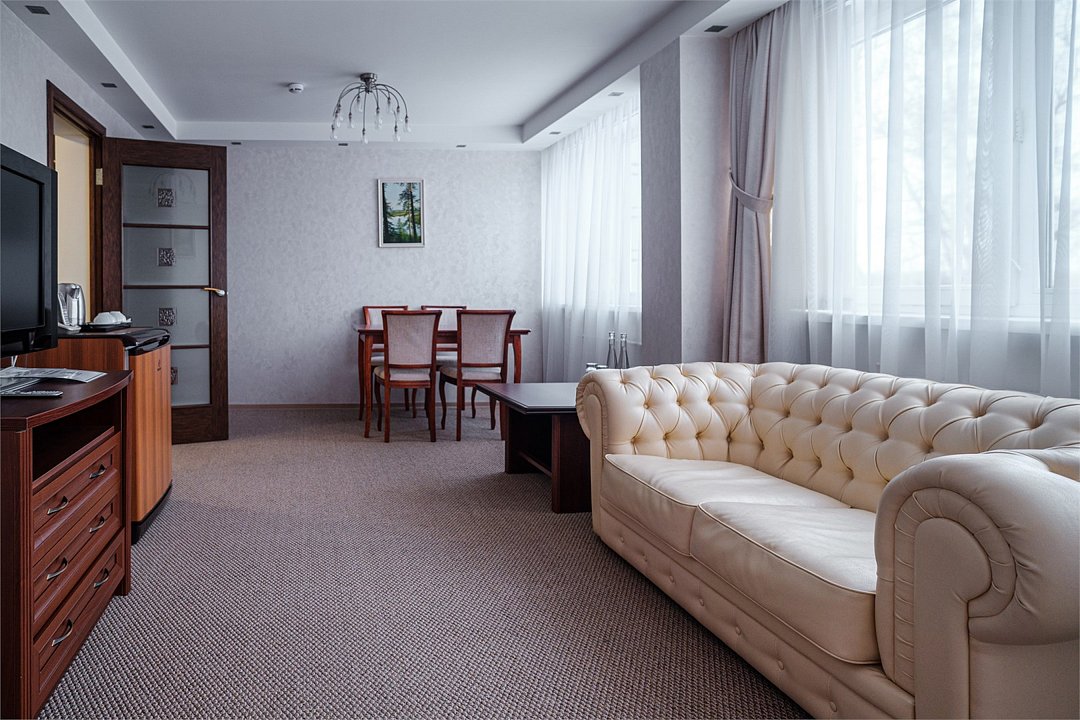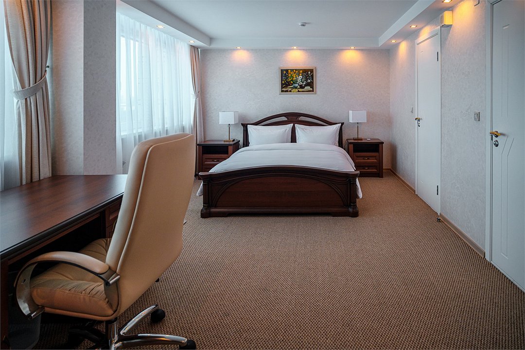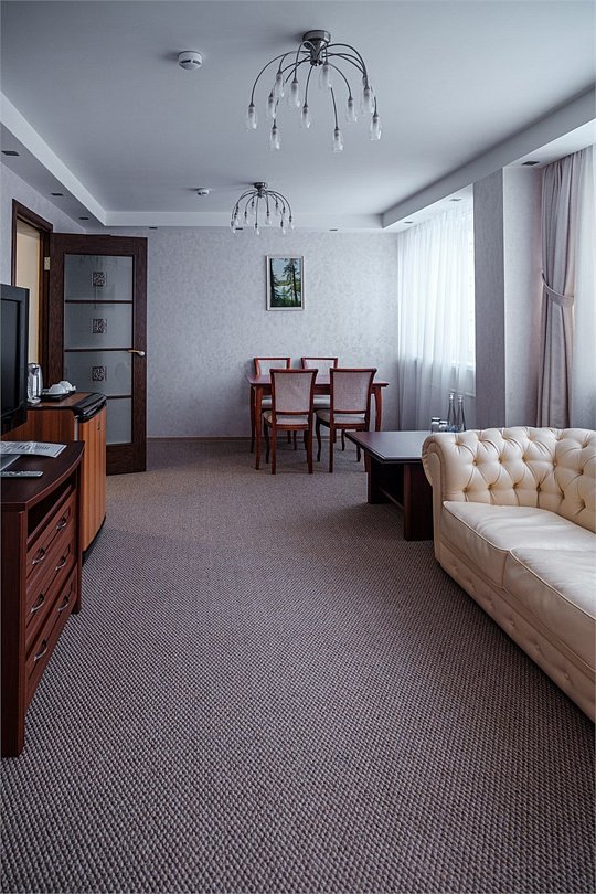Комфортный просторный номер, площадью 60 кв. м., оформленный в светлых пастельных тонах, состоит из гостиной, спальни, гардеробной и двух комнат гигиены. Апартаменты - отличный выбор для любого случая, максимально делового комфорта.Услуги и удобства