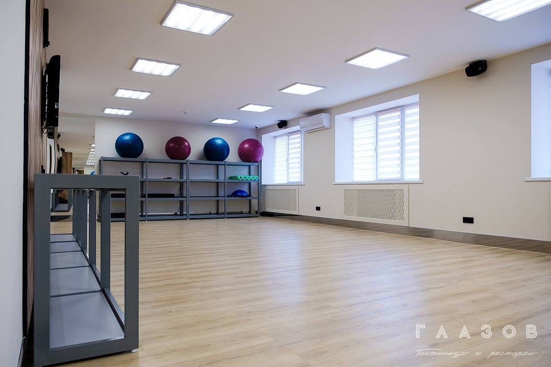 Фитнес-центр состоит из двух залов: тренажёрного и просторного фитнес зала. Комфортное, светлое пространство фитнес-центра оборудовано всеми необходимыми тренажерами и спортивным оборудованием: силовые тренажеры, беговая дорожка, велотренажёр, гантельный ряд, свободные веса, скамья для пресса, шары для пилатеса, полусфера, коврики для йоги. Качественное мультимедийное оборудование: телевизор, звуковая аппаратура создадут приятную атмосферу для занятий. Также всегда есть чистые полотенца и вода.