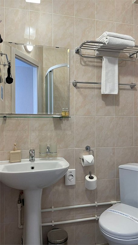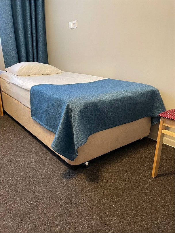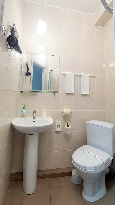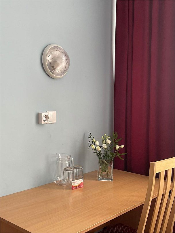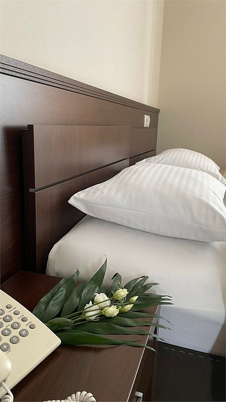 Однокомнатный одноместный номер первой категории площадью 12 кв. м. с односпальной кроватью. Окно номера выходит в тихий внутренний дворик. В санузле душевая кабинка, фен, мыло.Услуги и удобства