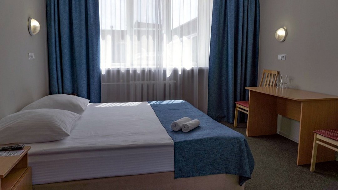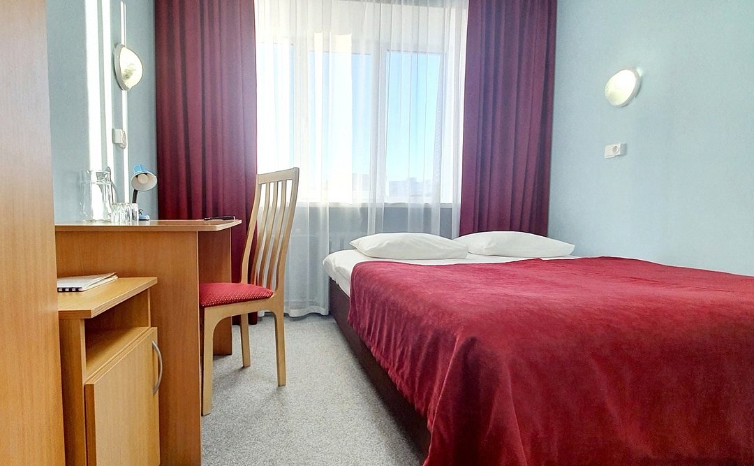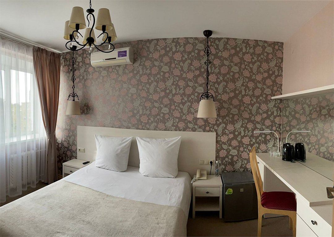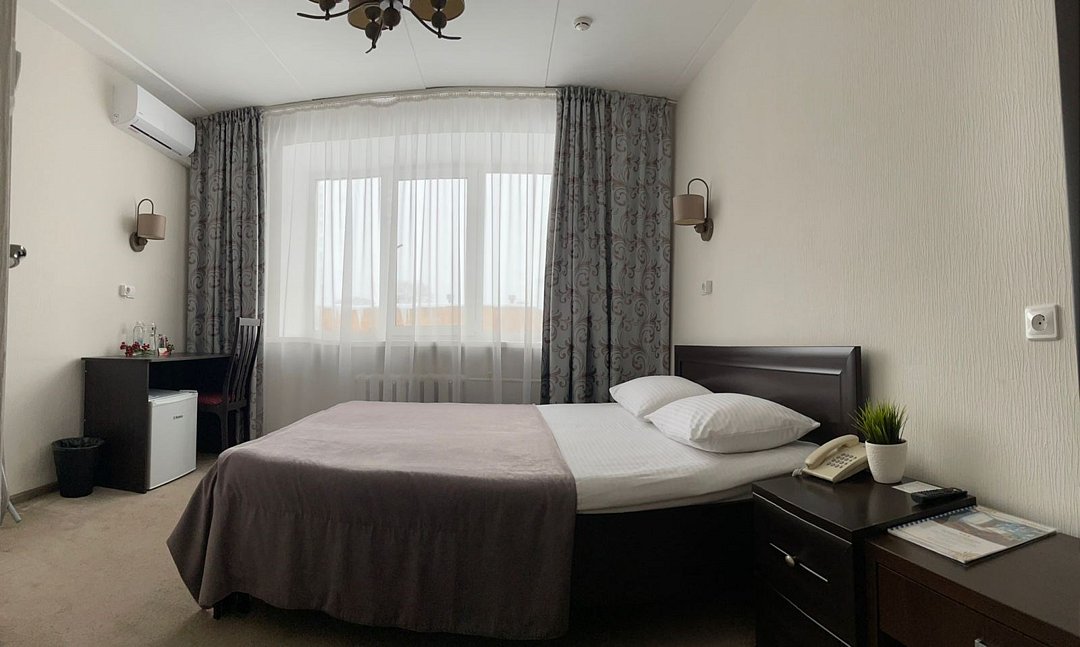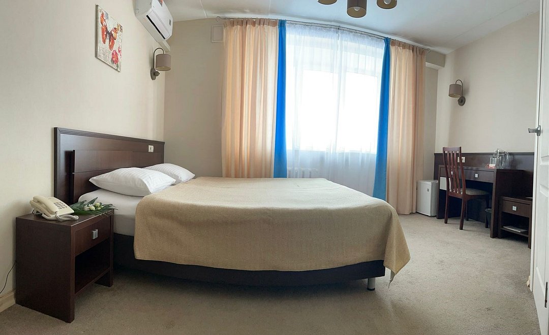 Однокомнатный номер первой категории с двуспальной кроватью оснащенный кондиционером, рабочей зоной с письменным столом. Мебель выдержана в классическом стиле. Предназначен как для одноместного, так и двухместного размещения. Имеет ванную комнату с душевой кабиной.Услуги и удобства