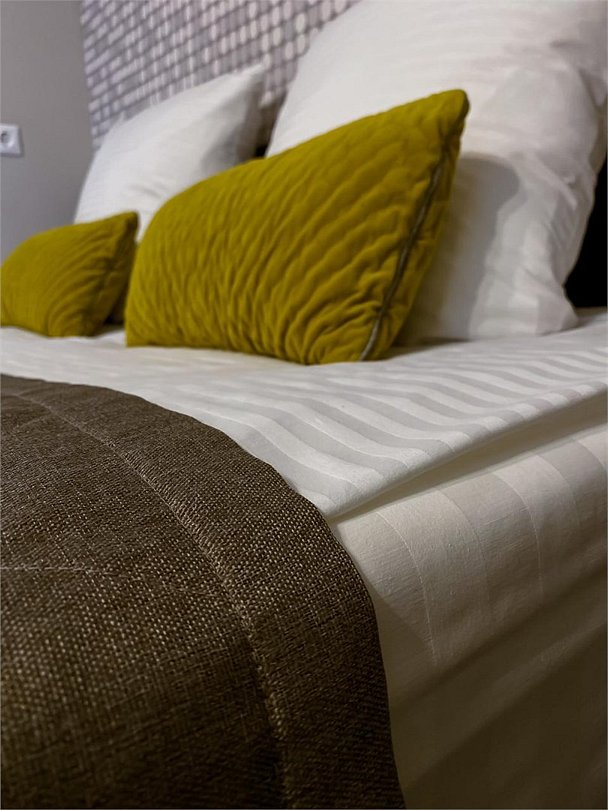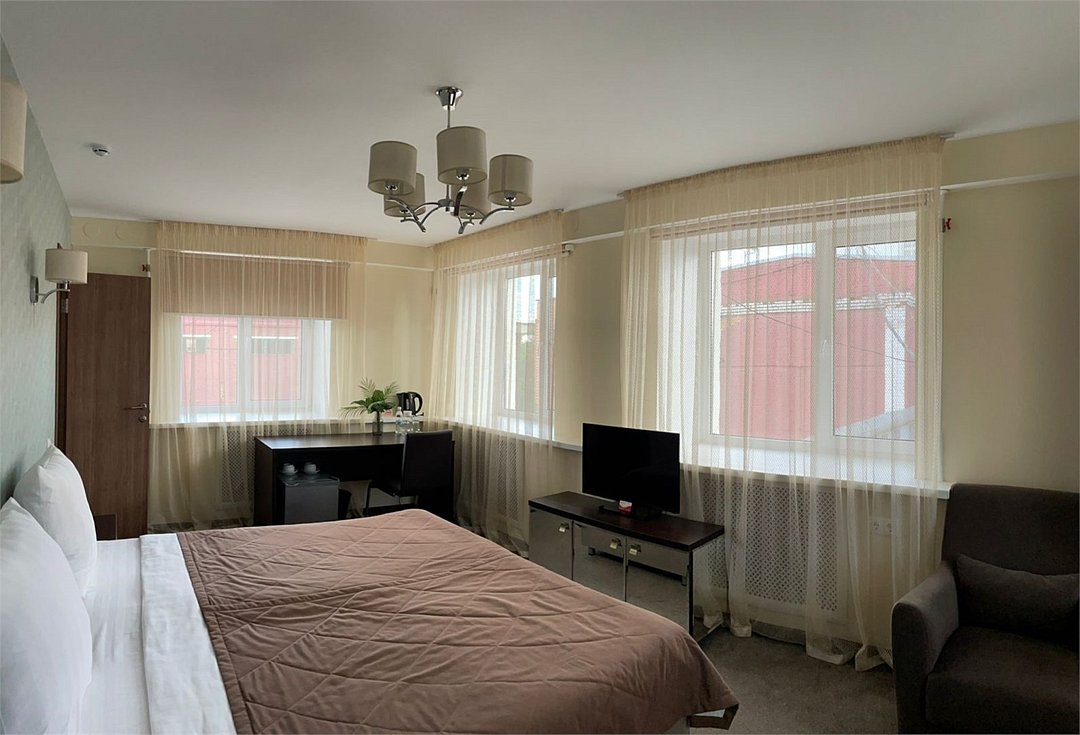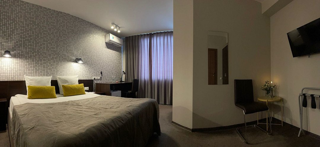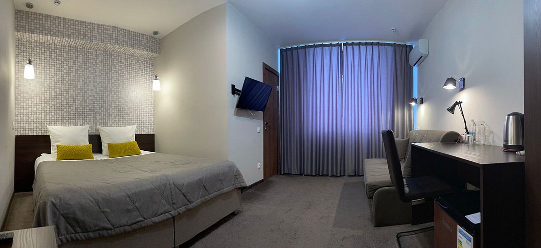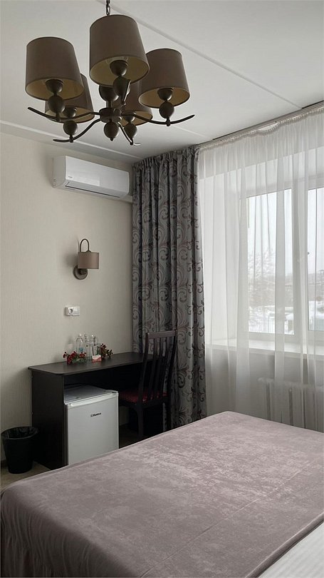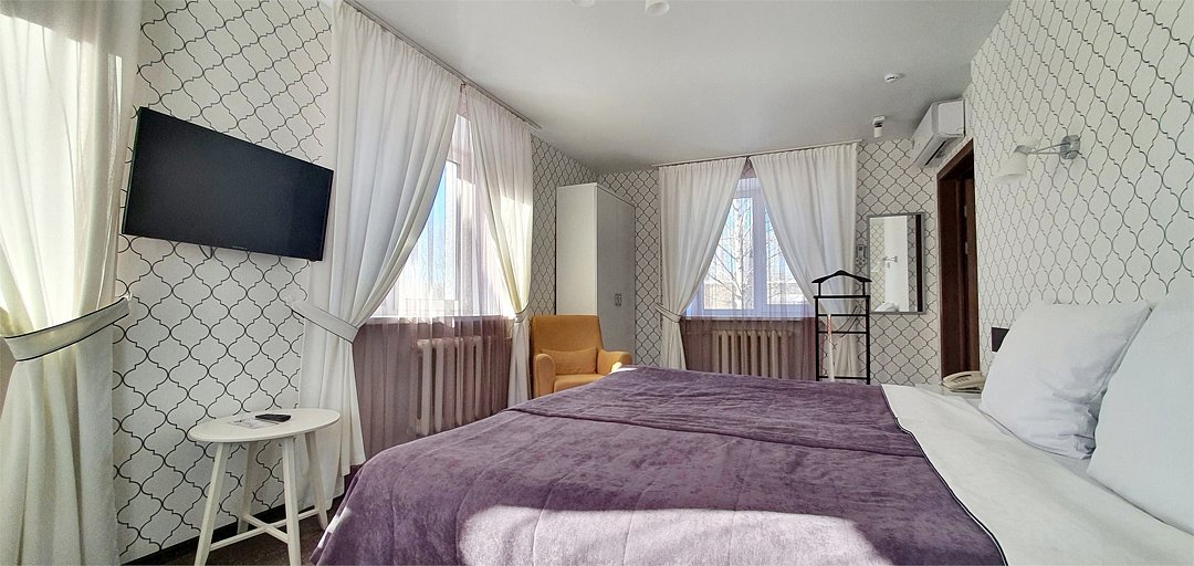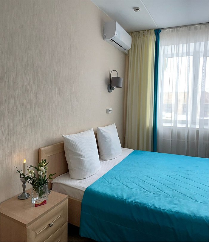 Однокомнатный номер первой категории с двуспальной кроватью оснащенный кондиционером, рабочей зоной с письменным столом. Мебель выдержана в классическом стиле. Предназначен как для одноместного, так и двухместного размещения. Имеет ванную комнату с душевой кабиной.Услуги и удобства
