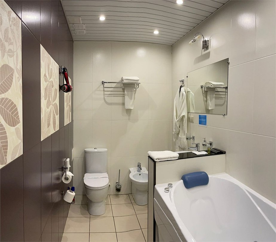 Wi-Fi, кондиционер, светильник, фен, душевая кабина, ванная с джакузи, биде, кровать «King size», тумбы, шкаф для одежды, журнальный столик, зеркало, чайный набор, чайник, питьевая вода, ковровое покрытие, отопление, кулер на этаже, две спальни, вид во двор, стаканы, туалетные средства, раскладной диван, внутренний телефон, телевизор с плоским экраном, мини-холодильник, москитная сетка, двуспальный раскладной диван-кровать, без питомцевВ номере