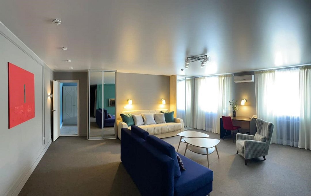 Wi-Fi, холодильник, кондиционер, светильник, фен, душевая кабина, халаты, банные полотенца, тапочки, гигиенические средства, сауна, кровать «King size», тумбы, стулья, шкаф для одежды, журнальный столик, письменный стол, зеркало, чайный набор, сейф, чайник, питьевая вода, гостиная зона, ковровое покрытие, вид на город, кулер на этаже, кресло, стаканы, туалетные средства, внутренний телефон, телевизор с плоским экраном, мини-холодильник, москитная сетка, двуспальный раскладной диван-кровать, без питомцевВ номере