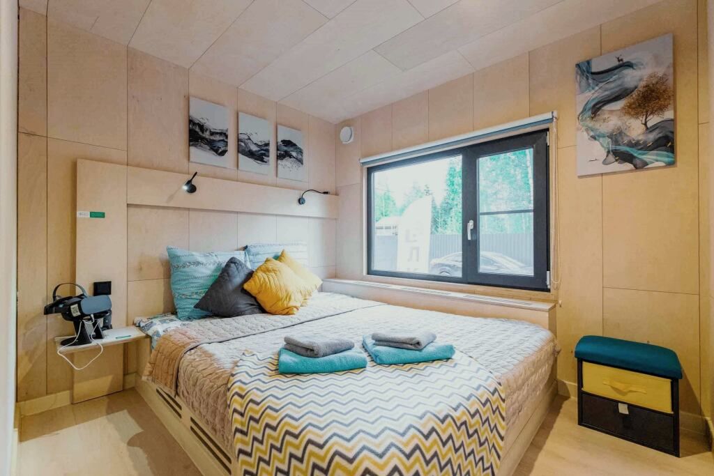 Двухместный коттедж O-frame Medium с красивым видом из окна двуспальная кровать