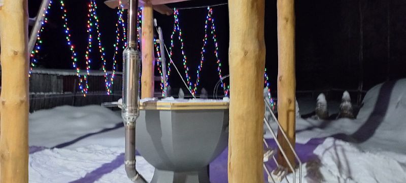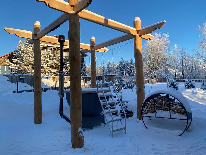 Теплый чан на открытом воздухе на огне, с целебными веничками и и пихтой. Вместимость: до 5 человек.