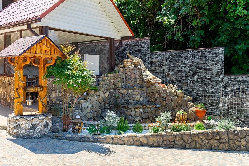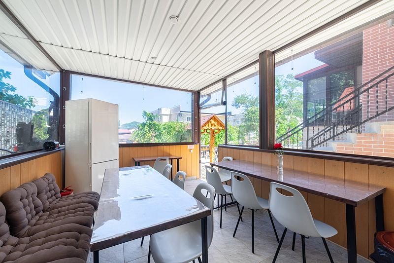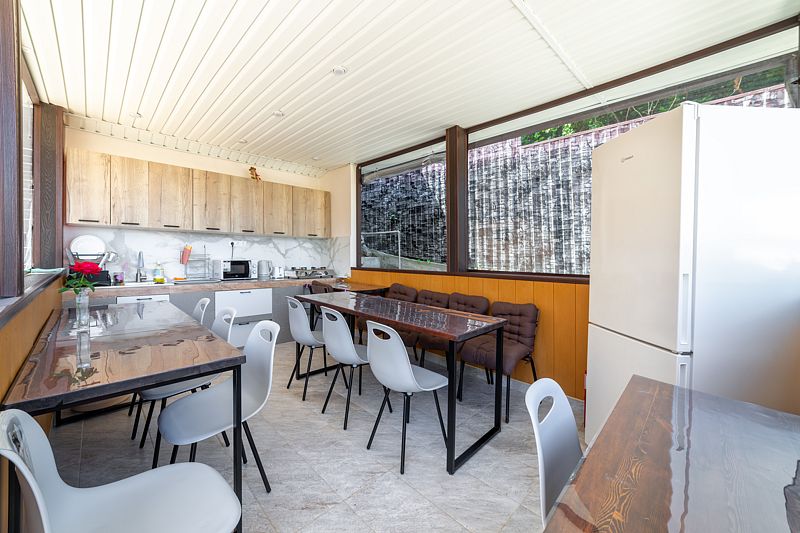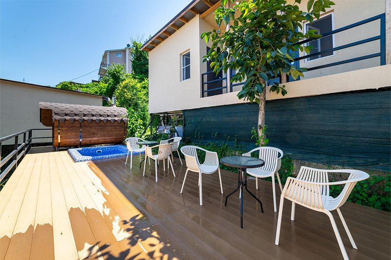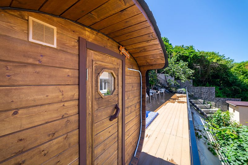 Гостевой дом предлагает своим постояльцам зону для отдыха, полную очарования и уюта. На первой террасе вас ждут удобные столики и кресла, где можно приятно провести время в приятной беседе. Но самое интригующее открывается, когда вы поднимаетесь по лестнице на второй этаж — здесь расположена еще одна терраса, на которой кроме привычных элементов комфортного отдыха, размещена русская баня на дровах с купелью.