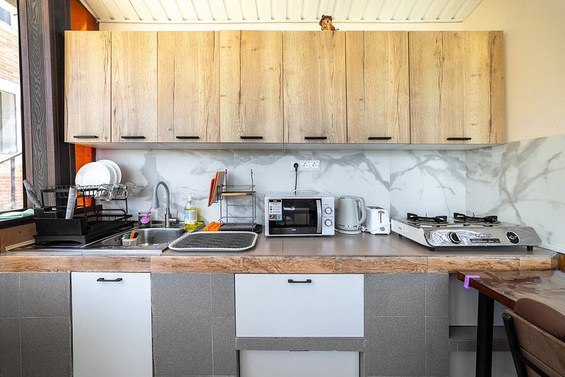 Кухонная зона позволяет гостям в полной мере ощутить атмосферу домашнего уюта во время их отдыха.