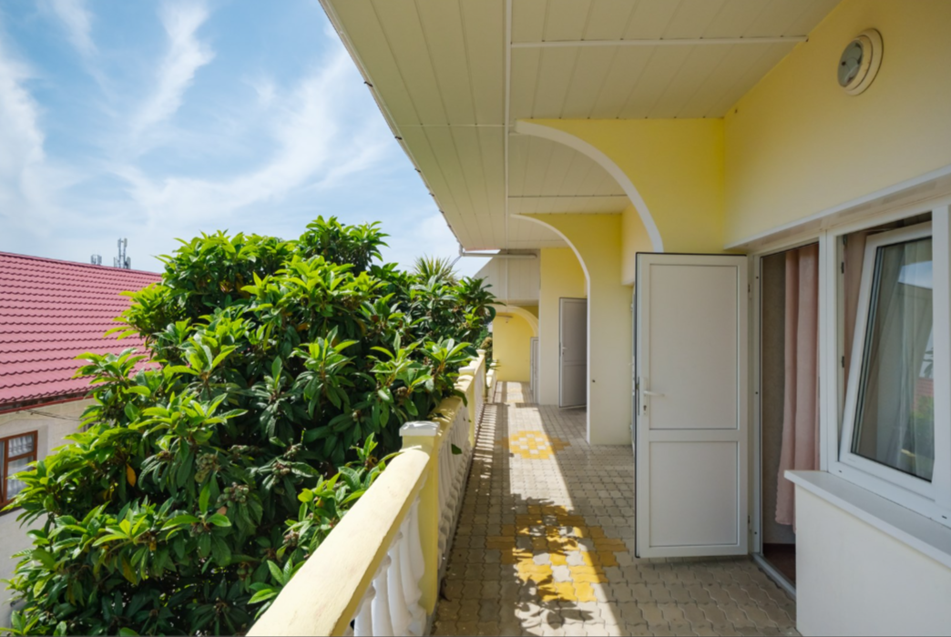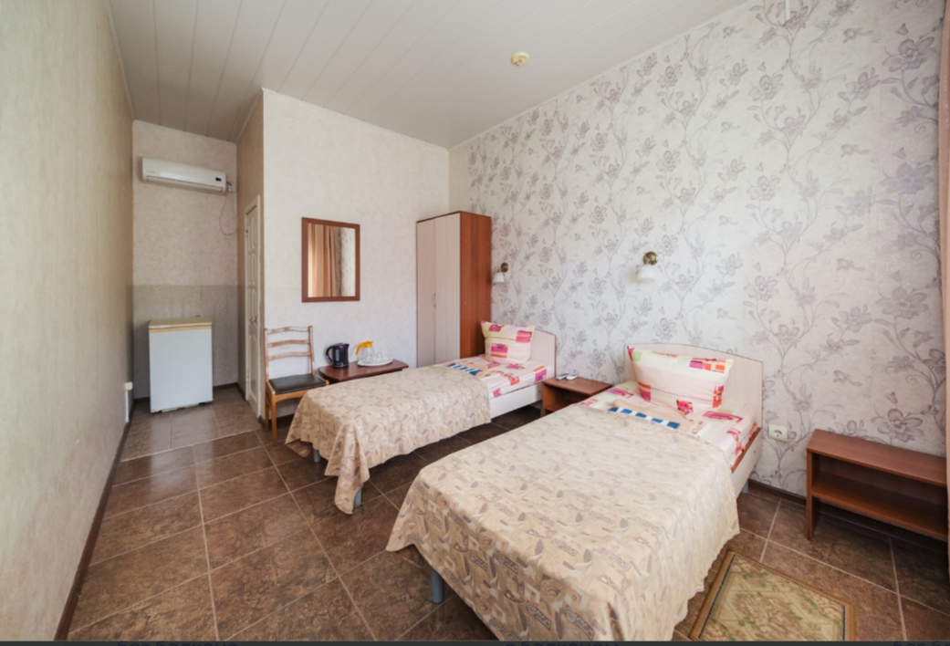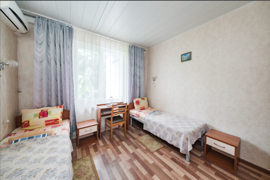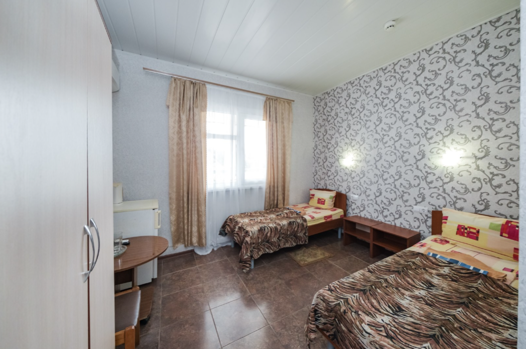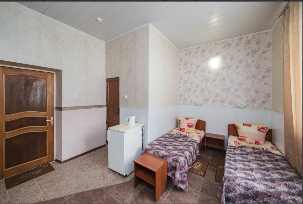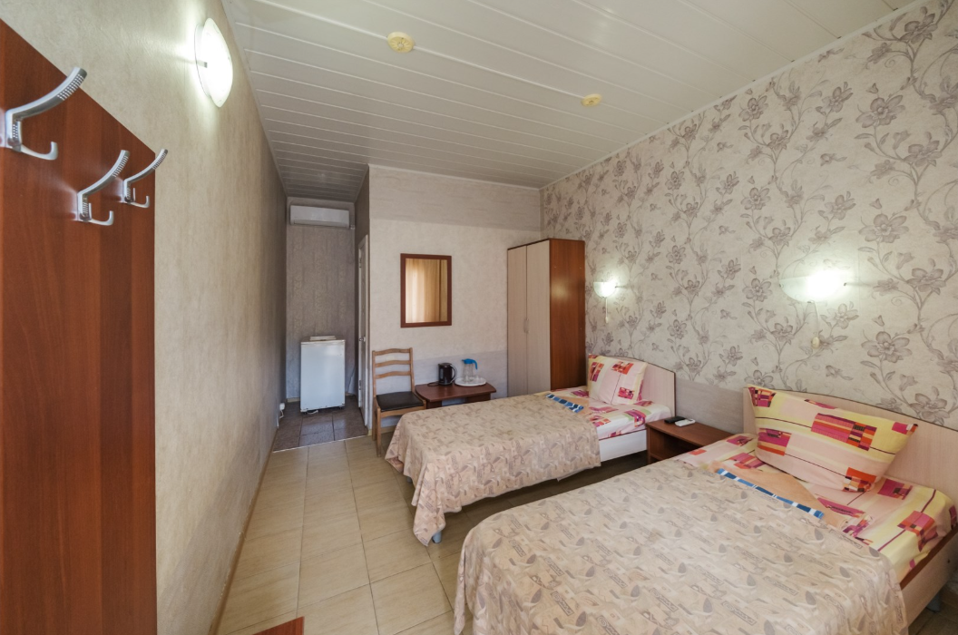 Комплекс занимает благоустроенную территорию площадью 4000 кв.м. и включает в себя 4 спальных корпуса в два и три этажа. Гостей ожидаю номера категории Стандарт, оснащенные санузлом, сплит-системой и необходимой бытовой техникой — телевизором, холодильником, электрочайником.