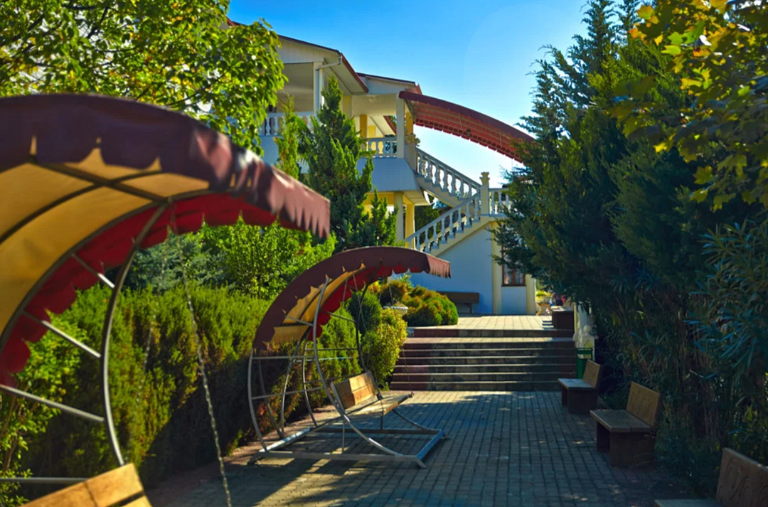 Пансионат для отдыха семейных пар и пар с детьми. Очень приличный,чистый бассейн детский и взрослый.Детская площадка.