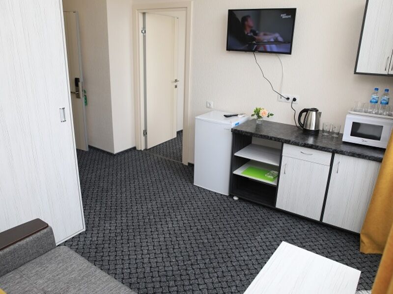 Кровать-трансформер (двухспалка или 2 односпалки), диван-кровать, мини-кухня, ТВ, сейф, 2 шкафа, тумбочки, журнальный столик, 2 сплита, санузел