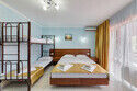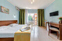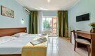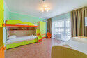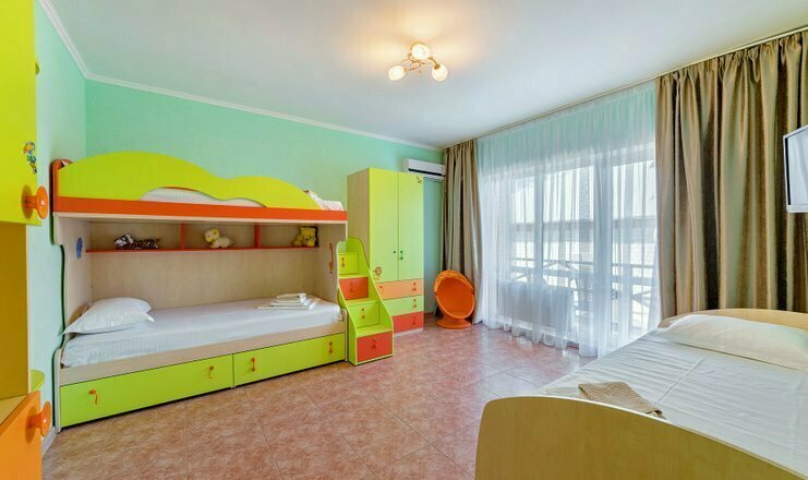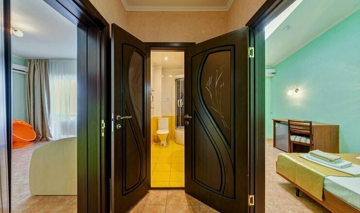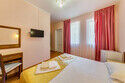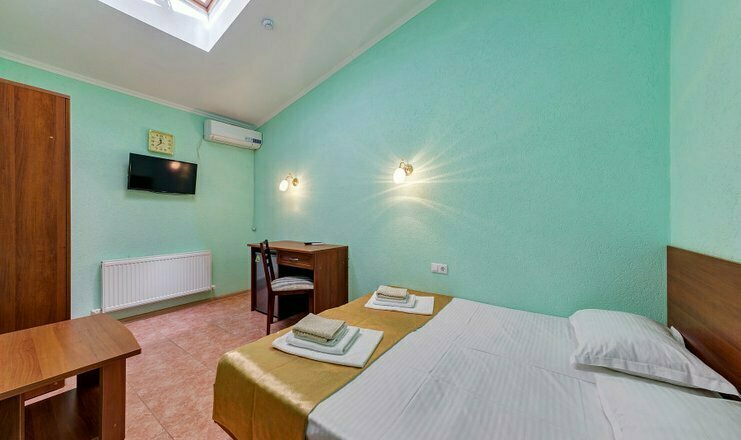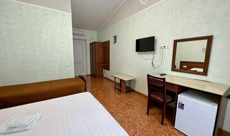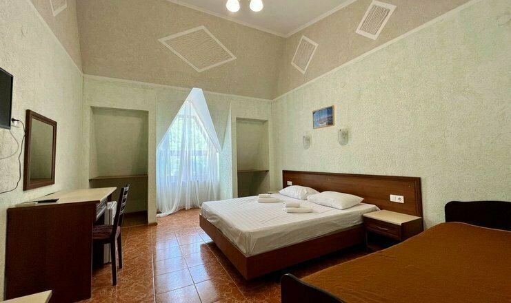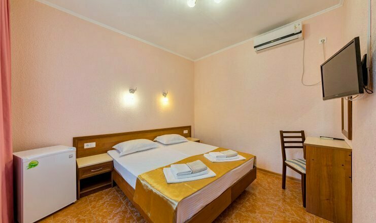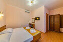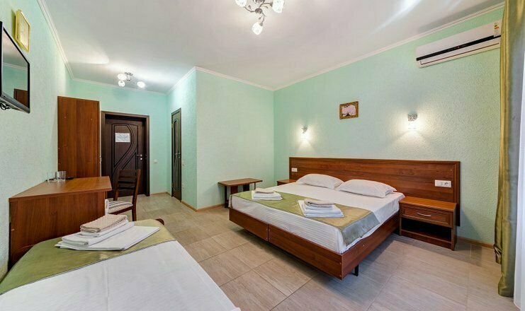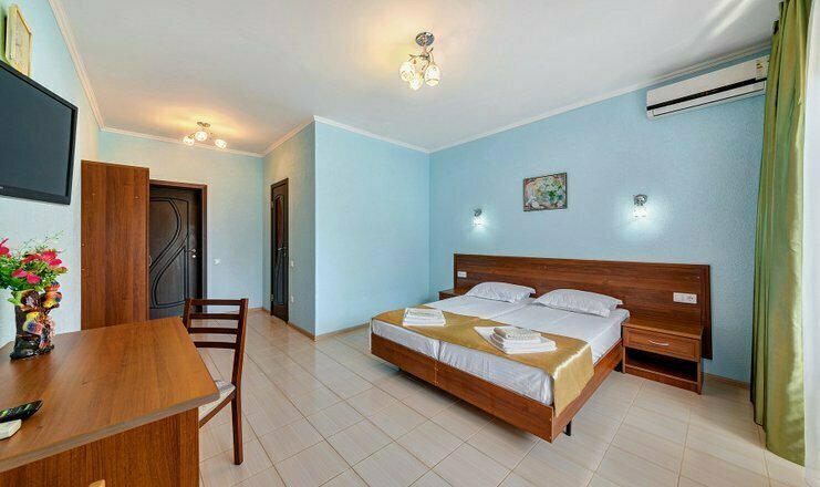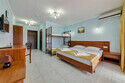 Кровать двуспальная (или 2 раздельные), тумбочки прикроватные, шкаф, холодильник, кондиционер, телевизор, фен, санузел (душ+туалет), доп.место - односпальная кровать или двухъярусная кровать