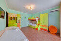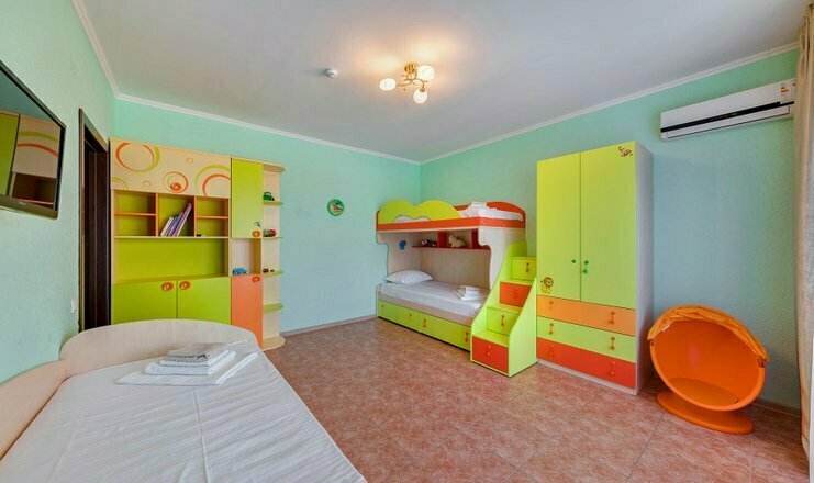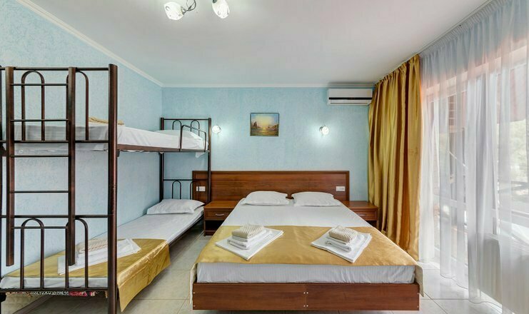 Кровать двуспальная (или 2 раздельные), двухъярусная кровать, односпальная кровать, тумбочки прикроватные, шкаф, холодильник, кондиционер, телевизор, фен, санузел (душ+туалет).