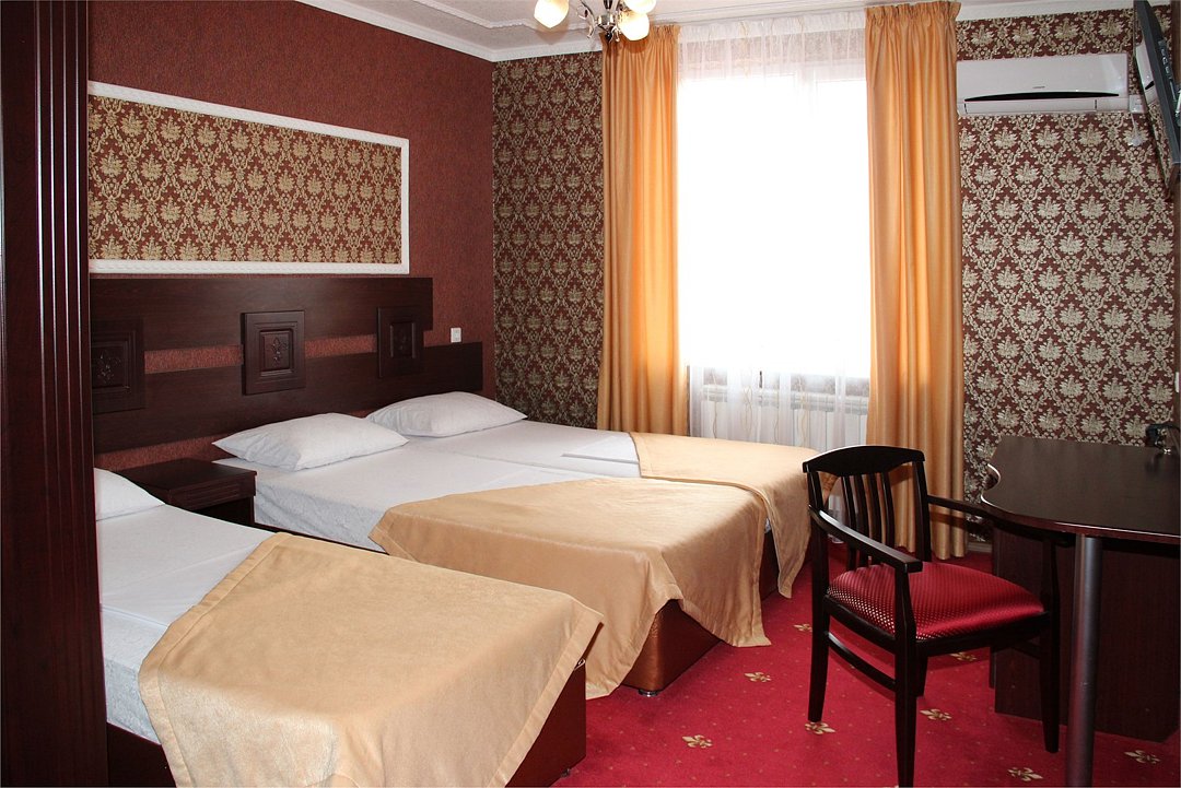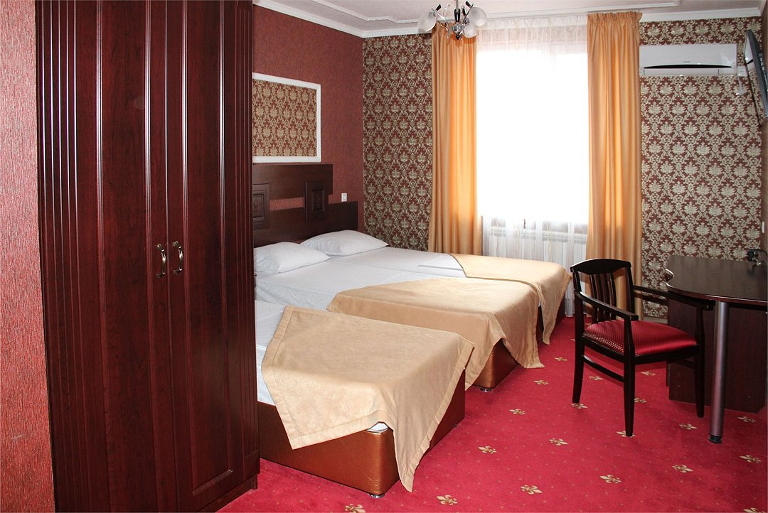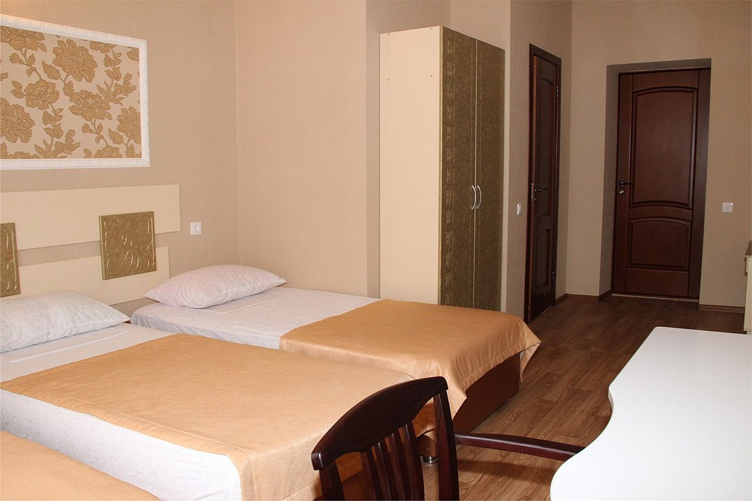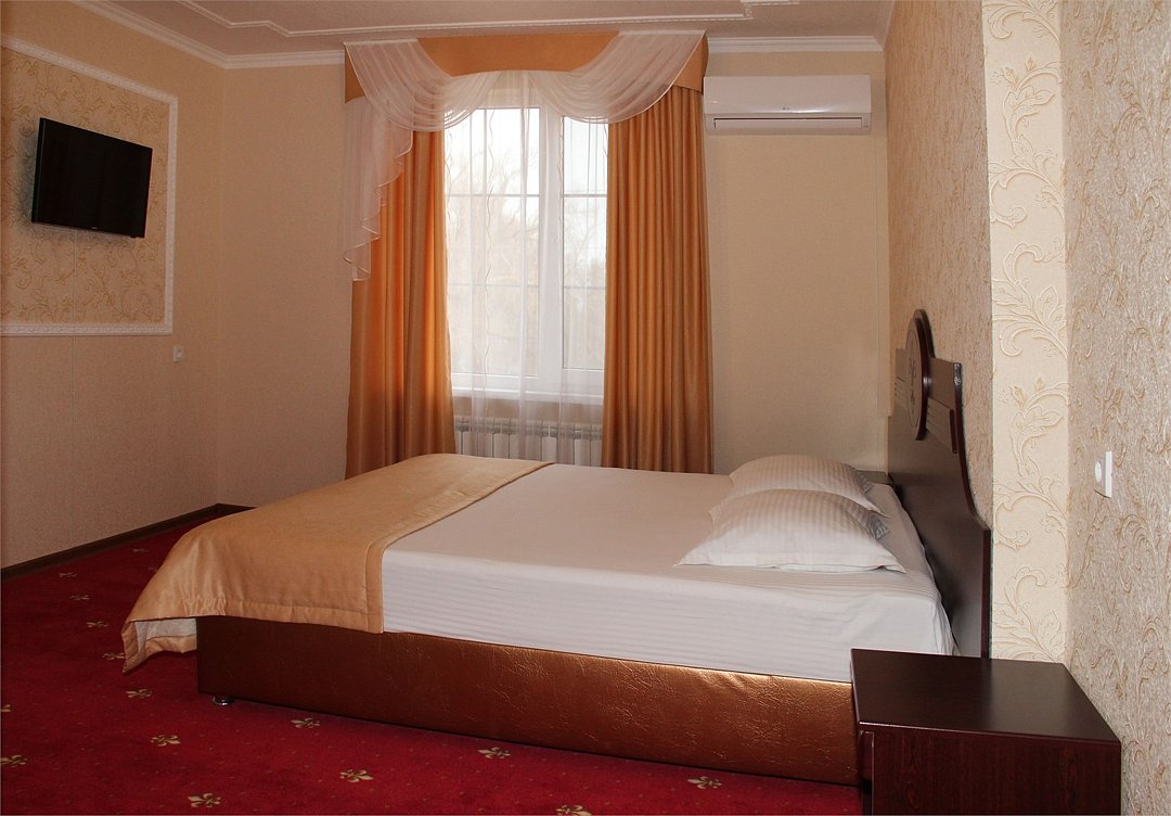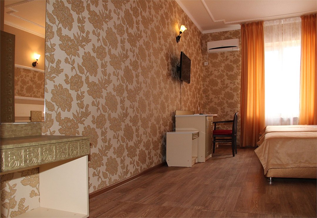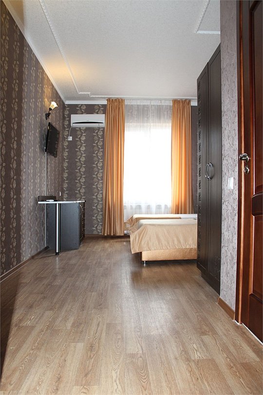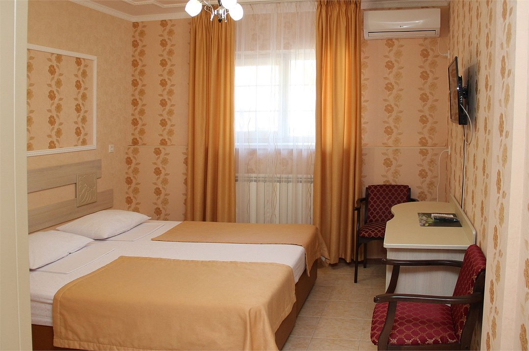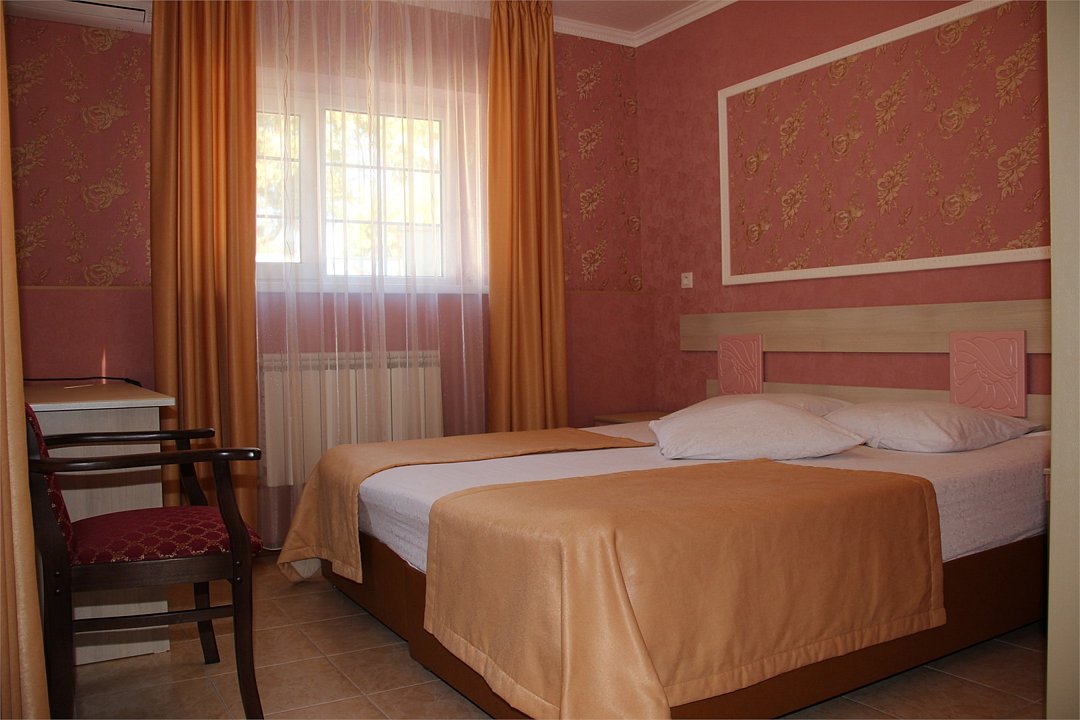 Собственная территория отеля, огороженная и охраняемая, благоустроена и озеленена, украшена цветниками. Трехэтажное здание отеля содержит номера категорий «люкс» и «стандарт», способные одновременно вместить почти 50 человек. Все комнаты – с отличной новой меблировкой, оборудованы отдельными санузлами с ванной или душем и туалетными принадлежностями. В каждом есть набор необходимой бытовой техники: сплит-системой, холодильником, сейфом, телевизором и Wi-Fi.