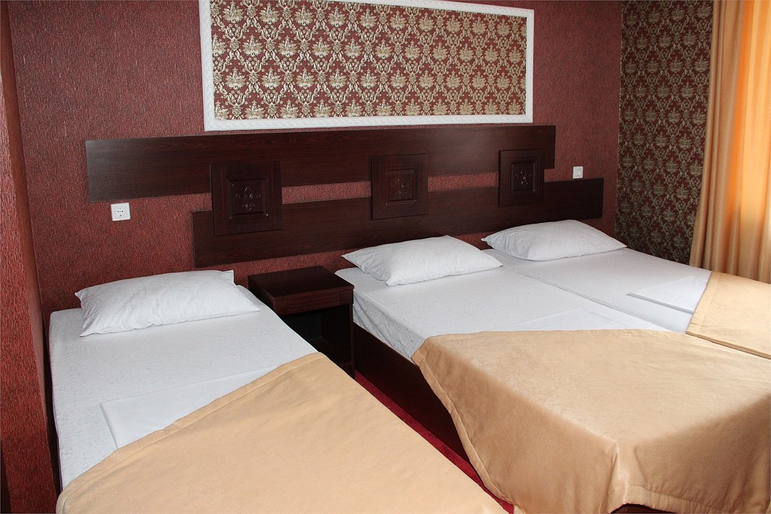 Wi-Fi, светильник, ванная комната, санузел, банные полотенца, гигиенические средства, двуспальная кровать, две односпальные кровати, тумбы, стулья, шкаф для одежды, вешалки, багажная тумба, зеркало, звуконепроницаемые стены и окна, набор посуды, обслуживание номеров, сейф, унитаз, раковина, отопление, душ, кулер на этаже, плиточное покрытие, вид во двор, стаканы, столовые приборы, стол, туалетные средства, туалет, сплит-система, цифровое тв, телевизор с плоским экраном, мини-холодильник, москитная сеткаВ гостиничном номере