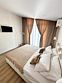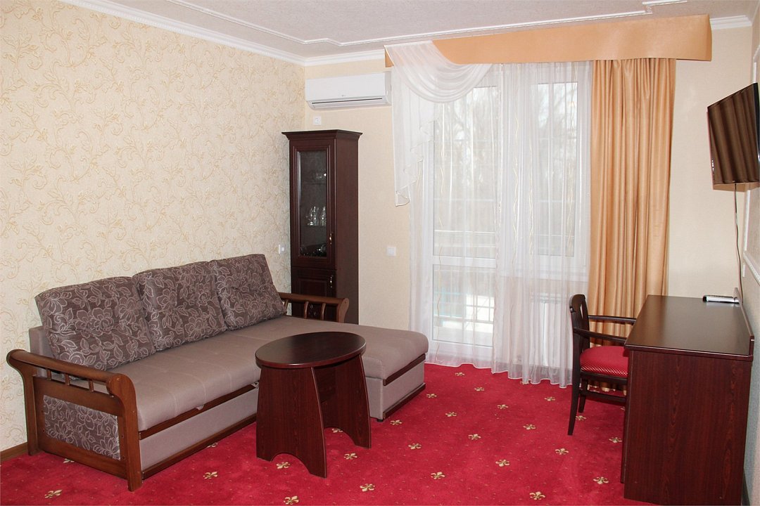 Двухкомнатный номер Люкс в классическом стиле. Есть номер в исполнении для новобрачных. В номере двухспальная кровать размера кингсайз и одна односпальная, диван-кровать с механизмом "дельфин", платяной шкаф, гардероб, прихожая с зеркалом, стол и два кресла,журнальный столик прикроватные тумбочки, прикроватная банкетка, шкаф с набором посуды, бокалами и столовыми приборами, 2 сплит-системы, 2 телевизора 32 дюйма с цифровыми каналами, холодильник, сейф, бесплатный WI-FI. Ванная комната с ванной, раковиной и унитазом. Индивидуальная косметика для ванны.Полный комплект полотенец. Балкон с удобными креслами и видом на море. Сушилка.Услуги и удобства
