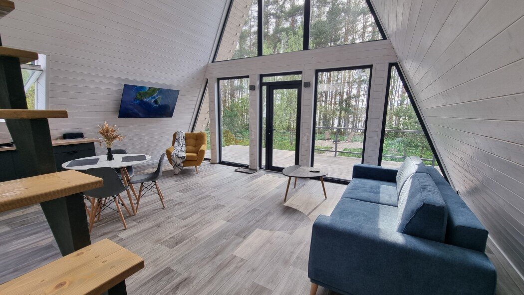 Большой дом А-фрейм, расположенный на участке 30 соток, на первой линии Можайского водохранилища. Вы можете забронировать дом на компанию от 1 до 6 человек. Дом подойдёт для тихого семейного отдыха. Вечеринки запрещены. Дом оборудован современной новой техникой и всем необходимым для приятного отдыха. Отопление тёплым полом. Шикарные виды из панорамных окон не оставят вас равнодушными. На территории костровая зона, которая позволит вам с удовольствием посидеть у костра в компании друзей и любимых. Есть мангал и барбекю. Выйдя из калитки вы попадаете в сосновую лесополосу, которая идёт вдоль берега водохранилища, прогулки выходят просто замечательными. Пляж и береговая линия практически сразу за калиткой. Для гостей доступен прокат сапбордов и велосипедов. В пешей доступности остатки усадьбы Горетово и старая церковь. В соседней деревне небольшой зоопарк. В 40-50 минутах езды шикарный сафари-парк с дикими животными, аэроград Можайский, где можно полетать на самолёте. В 30 минутах езды можно замечательно провести время катаясь на лошадях. В Можайске есть такой досуг как кинотеатр, бассейн и т.п. Любителям пара можно арендовать баню на турбазе, которая находится в 200 метрах. В 5 минутах на авто находятся сетевые магазины и пункты выдачи.