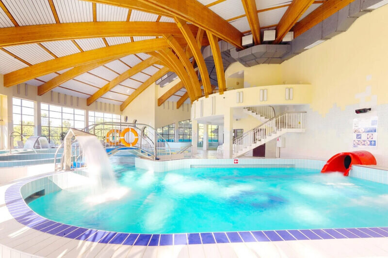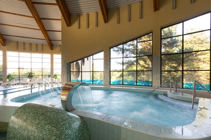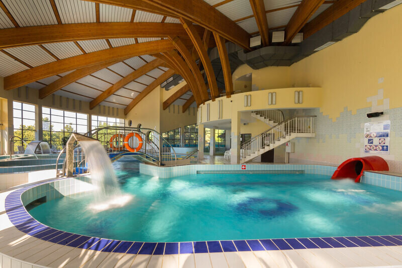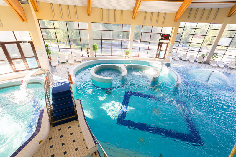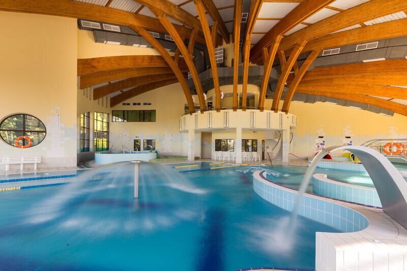 Уютный аквапарк пансионата «Поляны» привлекает спокойной атмосферой, живописными видами и разнообразными водными развлечениями для гостей всех возрастов. Основной бассейн аквапарка оборудован двумя дорожками, подходящими как для свободного плавания, так и для индивидуальных или групповых занятий. Для детей предусмотрена отдельная зона с неглубоким бассейном, фонтанами и гейзерами, а также ручеек и мини-бассейн для самых маленьких гостей.