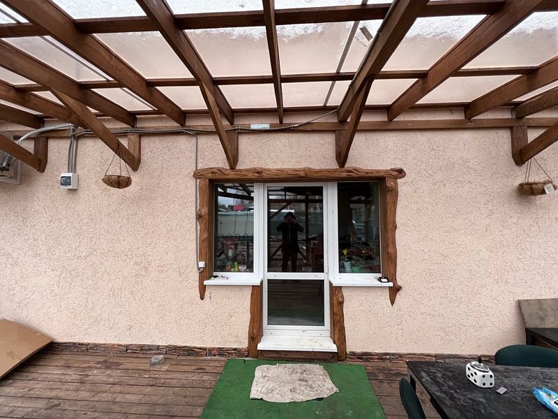 Выход из дома на патио с летней кухней и доступом к бассейну