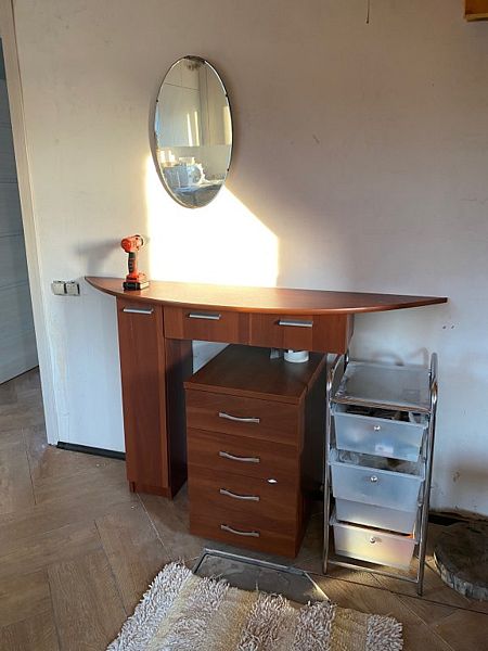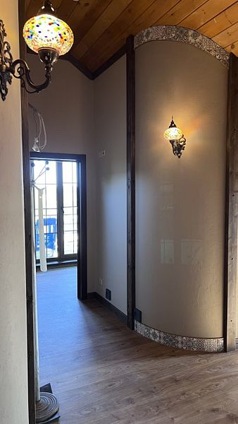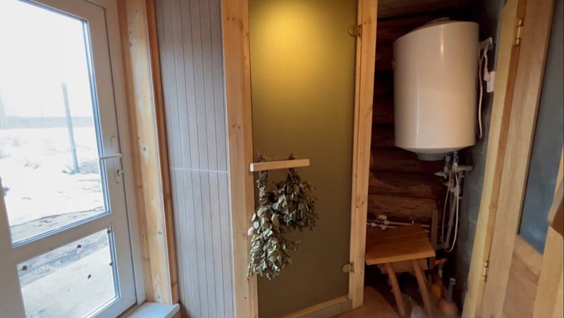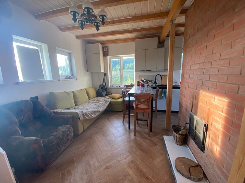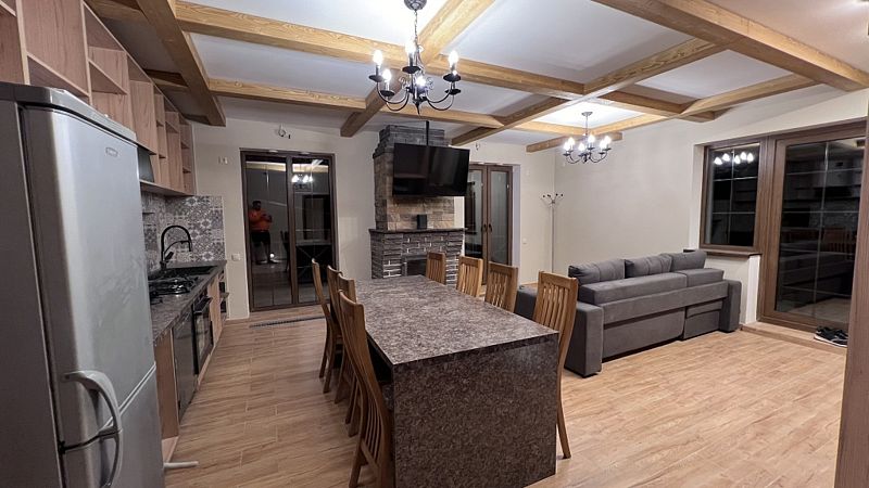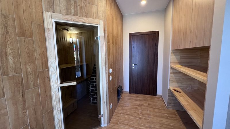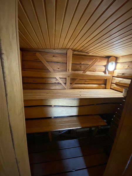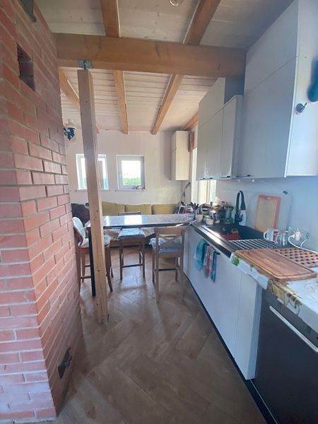 Первый этаж: зал совмещенный с кухней (посудомоечная машина, газовая плита, дровяная печь-мангал-камин, баня, душевая, туалет, стиральная машинка)