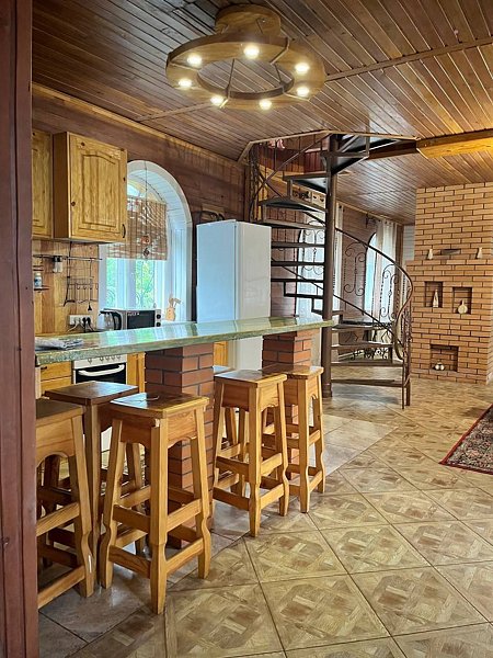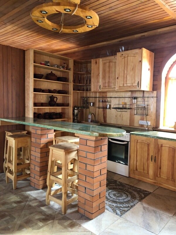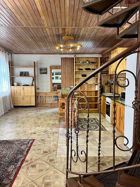 Гостевой дом в два этажа с дизайнерской отделкой и деревянной мебелью ручной работы. В доме есть интернет. Теплые полы для комфортного проживания зимой.