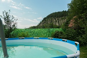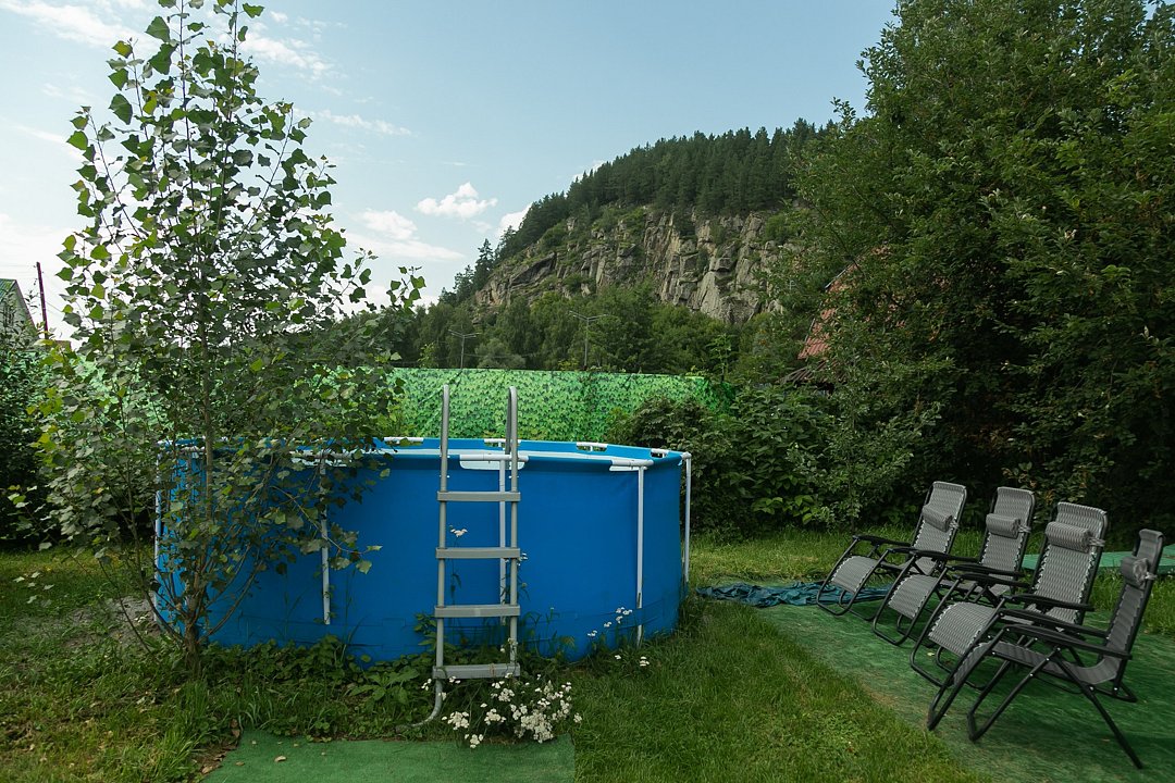 Сезонный бассейн с красивым видом на гору обеспечит возможность освежиться в жаркие дни или после посещения бани.